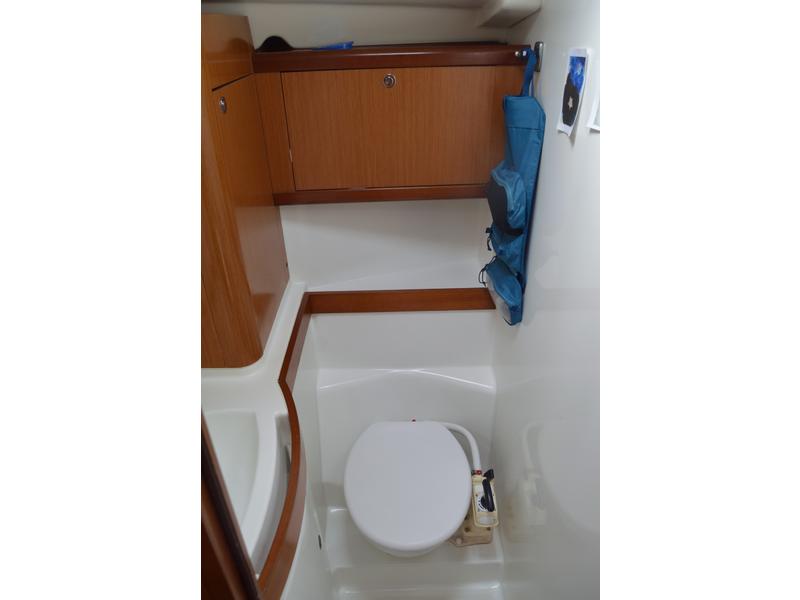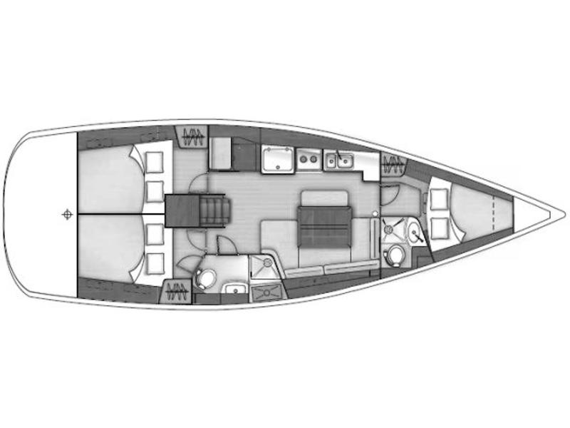 Layout: (See layout picture) - Owners cabin in V-berth with private head (Jabsco) and shower - Double aft cabins - Head (Jabsco) and shower cabin to starboard - Long galley and chart table to port - 80L Holding tank