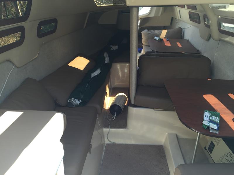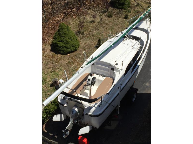 Comes with roller furling jib, main sail and bimini top that covers most of cockpit. A must see for anyone wanting a versatile trailerable boat. Bow has a V-berth, with an opening overhead hatch and storage underneath. Dedicated head w/its own door is to starboard w/detachable Porta-Pottie. Salon features a dinette to starboard, and a settee to port. The case for the centerboard forms a non-obtrusive wall between the dinette area and the head. There is a cushion to allow you to convert the dinette into a single berth. Cabin electronics just overhauled, with 2 new batteries (house and motor) plus USB chargers and AC cigarette adaptor socket. Included with this boat is a new mast raising system ($450), a Garmin hand-held navigation device ($250 new), ladder ($300), custom boat tarp to wrap boat in winter ($500), and a West Marine hand-held marine radio ($250 new), 2 fishing rods ($300), along with an assortment of tools and supplies. Clean title, registration for boat and trailer runs through 2023.