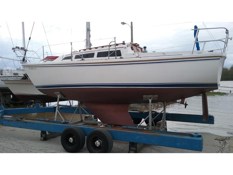 Tiller steering with auto pilot, Harkin jib furler, new North Sails main and jib, second set of sails, safety equipment, dodger, head and holding tank, head rebuilt, Origo stove, pressure cold water, Garmin chart plotter, DCS radio, dripless stuffing box. Mast rewired with new fixtures LED bulbs. Hull solid, no Catalina smile. Well maintained, inside storage last 10 winters. In the water Bay City MI.