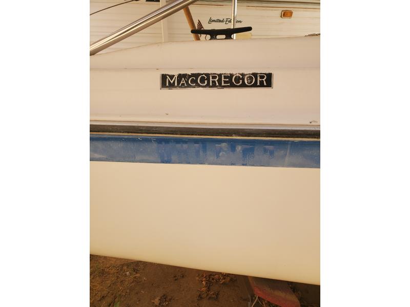 The hull is in good condition with no soft spots or rot of any kind on the decks. All the standing rigging, rails and lifelines are in good condition. The hatches all fit tight. The main sheet is attached to the boom and is in good condition. The sail inventory includes the main and a jib. This Mac also includes equipment spinnaker. The stainless steel swim ladder folds up. This MacGregor comes with a 9.0 Tohatsu engine. It comes with a trailer but will need new tires and a battery as it has been used little as of late.