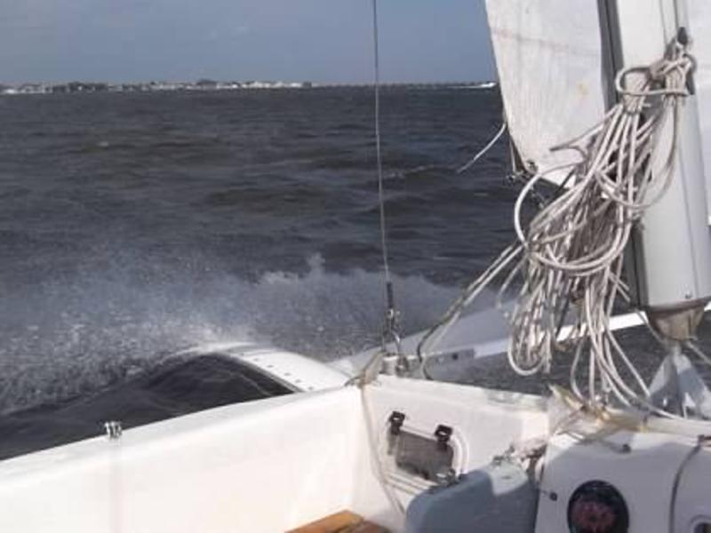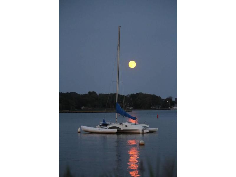 Designed by Dick Newick and built by John Olin. Custom modified trailer is included. The boat has been out of the water for a few years. The sails have been kept indoors and are in good shape.