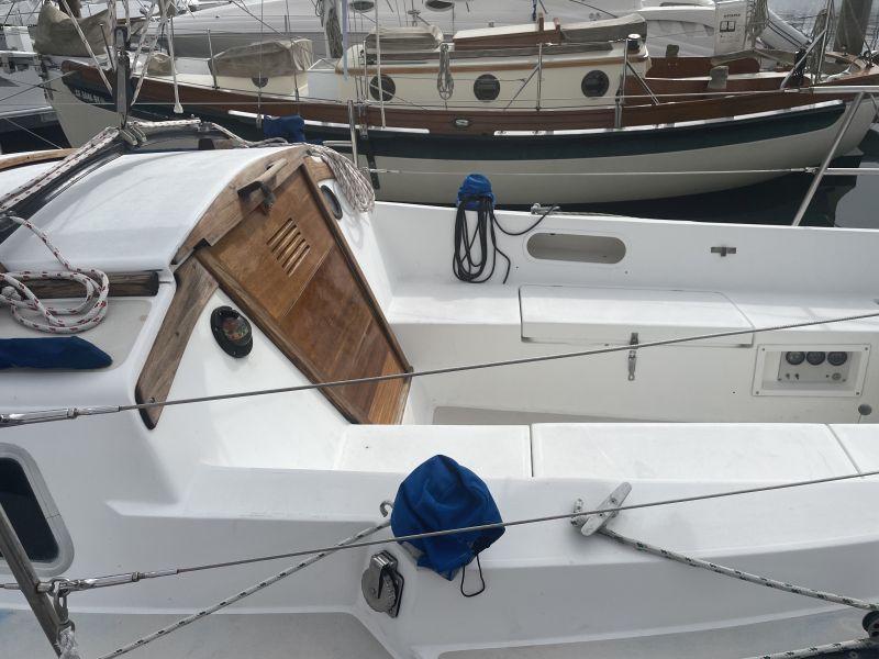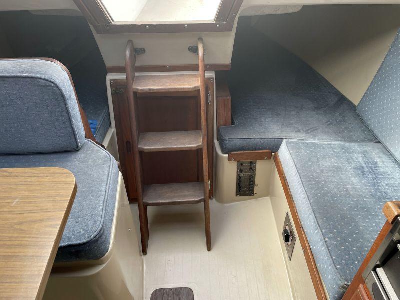 Engine: original Universal 5411 2 cylinder diesel, runs great. Running rigging: new. Standing rigging replaced about 10 years ago upgraded in size. Sail: 120 % genoa by Santa Cruz Sails, battened main, colorful spinnaker with sock. Wood: good conditioned and recently treated. Top sides: show a little age but no crazing or damages. Compass and knot meter. |