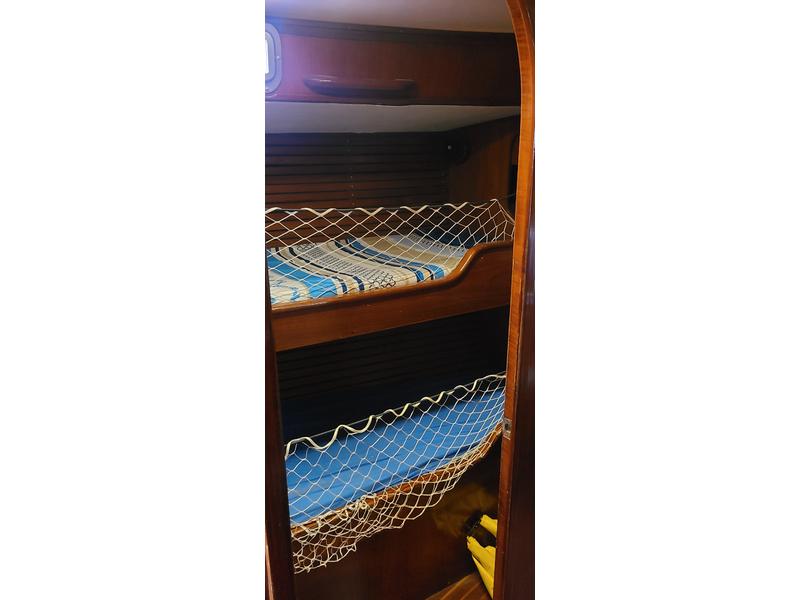 Luxurious Accommodations: Below deck, you'll discover a warm and inviting interior with three cabins to accommodate the entire family. The aft state room features a queen-sized bed and ample storage, providing a comfortable retreat for parents. The midship cabin is equipped with cozy bunk beds, perfect for the younger sailors. At the bow, the v-berth welcomes you with a large double bed.