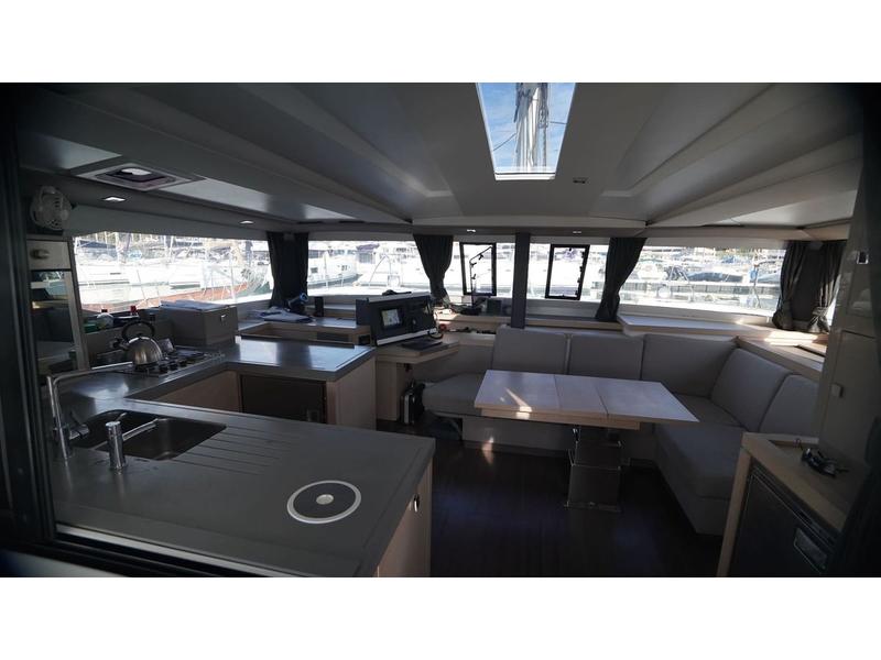 Kitchen and saloon : Double sink with two taps (fresh and sea water) Three-burner cooker with oven 12v fridge 12v 90L freezer Two 12v fans 32' flat screen TV Electric multifunction saloon table with remote control and bench seat