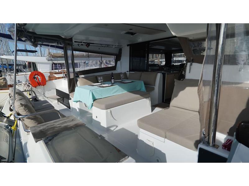 Deck : Quick 1000w electric windlass Main anchor with 60 m chain Spade anchor 25kg (new June 2022) Secondary mooring Fridge (12v) Stainless steel gas griddle Goot steering wheel with brake Rigid bimini with awning that completely encloses the outer saloon and helm station Batyline window curtains Canopy