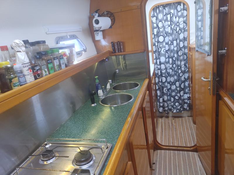Galley Thereis plenty of storage with: A large pantry Storage cabinets Eno three burner propane cook top Two stainless sinks one with a Whale sea water pump Sharp Carousel convection microwave Refrigerator Midea 3.5cu ft Freezer Zokop air fryer