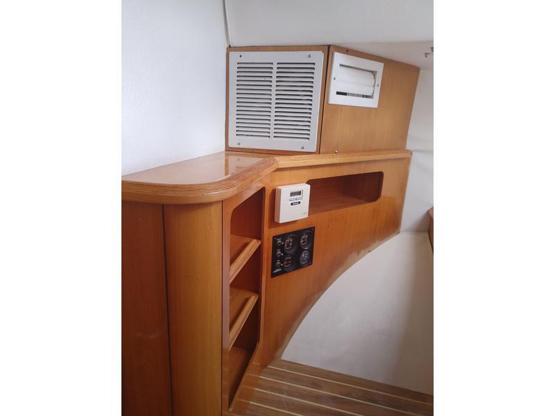 Multiple storage lockers are located midship in the starboard hull There is beautiful light cherry woodwork throughout the interior
