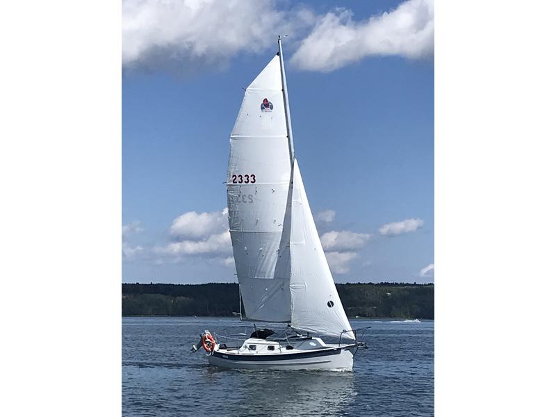 2019 North Nordac full batten mainsail and North Nordac with 4 sets of reef points; 2019 100% jib with three battens with receipts; 2019 renovated Performance single axel boat trailer with receipts, 2002 freestanding GMT Composites spar with new 2023 base post with receipts. Autohelm knotlog/speedo sailed mostly singlehanded. Tiller steering, 2021 lifelines replaced; SS boarding ladder, running and masthead lights,life ring, 2015 Plastimo Contest bulkhead compass, sliding galley option with storage underneath, 6 stainless port lights with screens, lewmar overhead hatch forward, 2021 deep cycle battery, brass manual water pump etc.