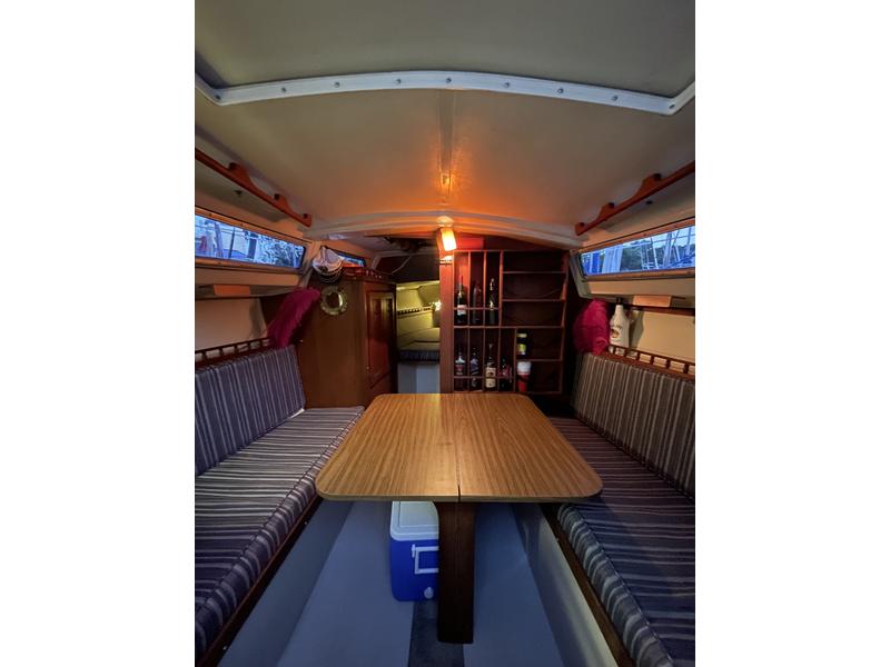 Inside: Interior cushions almost brand new, and professionally cleaned in spring 2024. Not all the cushions are shown in the photos, but I have them for the V-Berth, Port Side Seat, and Starboard Rear Berth. Original alcohol stove and sink. Refinished all wood accents in 2024. Foldup settee.