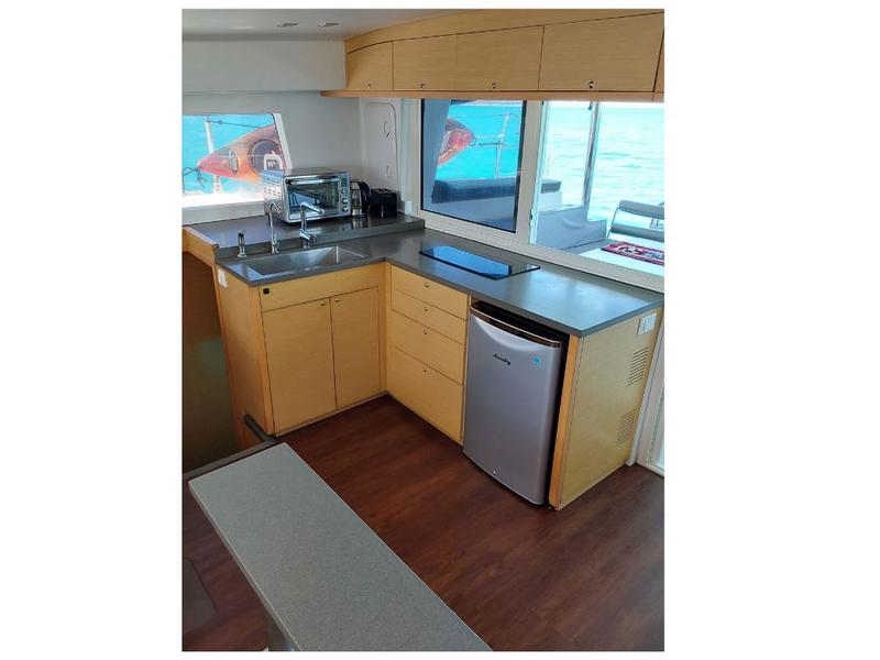 GALLEY Dual burner induction stove 110v (2022) Stove top oven 110v (2022) Standup freezer, 7.1 cubic feet 110v (2022) Under counter refrigeration unit (Nov 2022) New Corian counter tops (2023) New double stainless steel deep sink (2023) Saltwater pump and tap Fresh water carbon filter and tap Full kitchen appliances, toaster, kettle, blender, soda stream All cutlery, utensils and dishes Large spice storage built in the counter