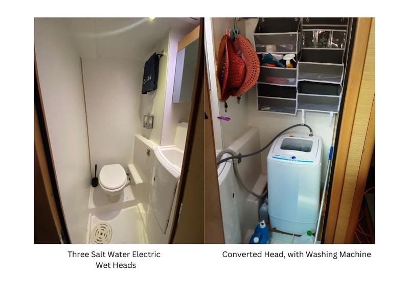 CATAMARAN INVENTORY; 4 cabin version, with macerator electric toilets 4 wet showers Raymarine E125 12.4" display at helm with P70S control head and 2 I70 displays Raymarine I70 display and I60 wind indicator at Navigation station VHF Radio with new antenna and cable inside the cabin New Helm Station Hard top with plexiglass rear window (2023) 1 hot water tank Fans 12 volts in each cabin 2 x 12 volt fans in saloon Bedding, pillows included Sun canvas, back and starboard side New queen mattress in starboard aft Washing machine in forward starboard head (toilet has been removed & stored on boat) New Bilge pumps and float switches 2023/2024 X6 beach / deck chairs, sunshade and water inflatables Tools and spare parts