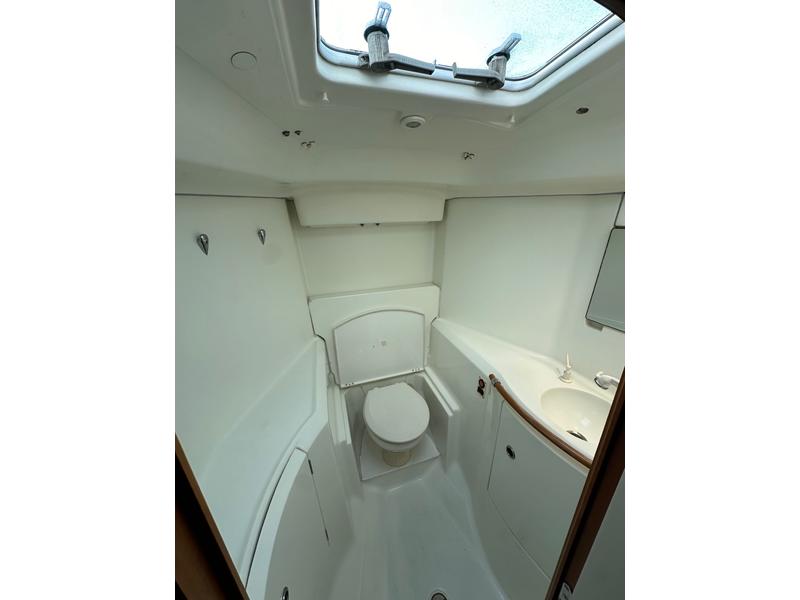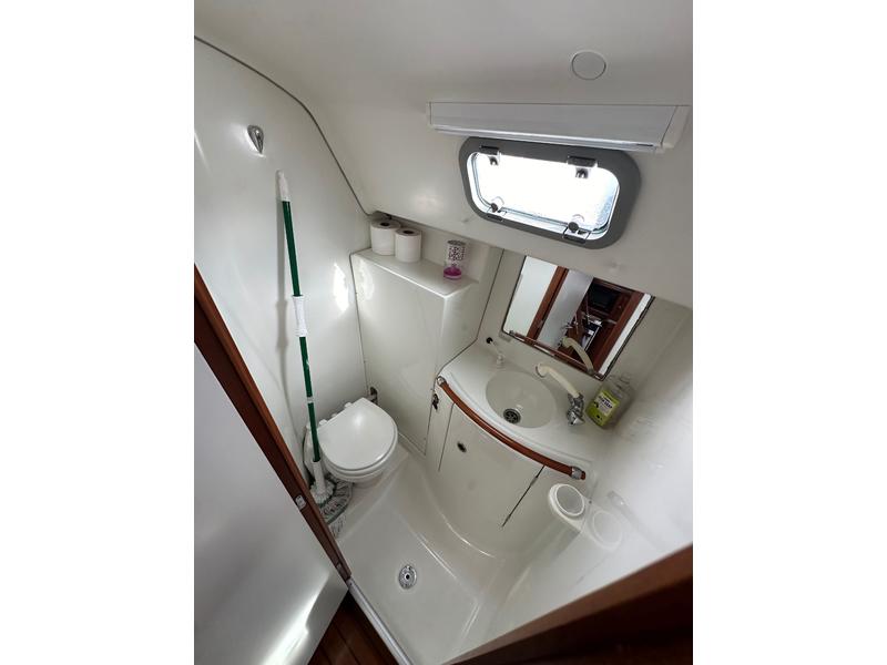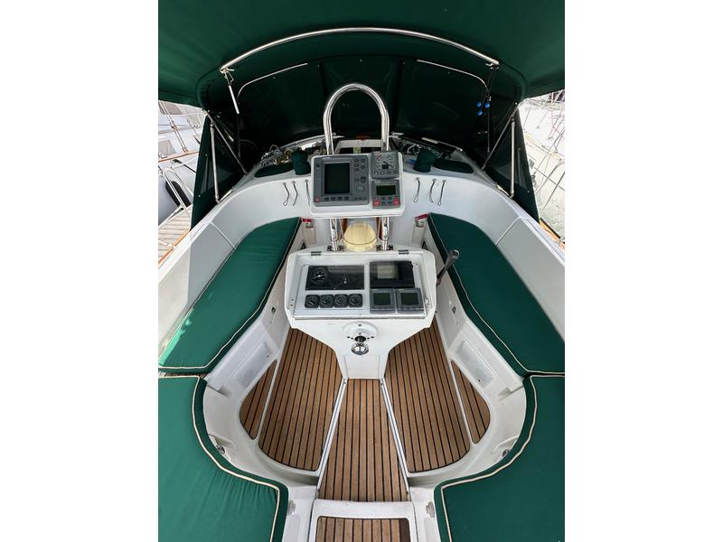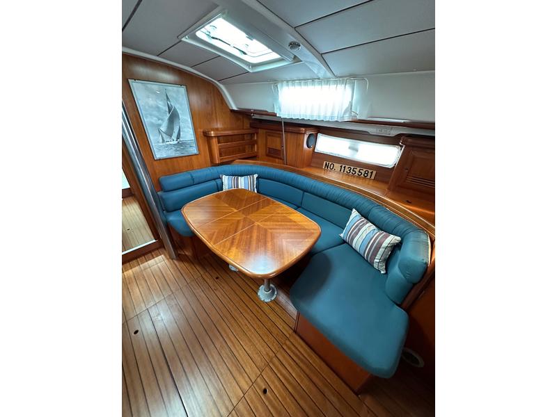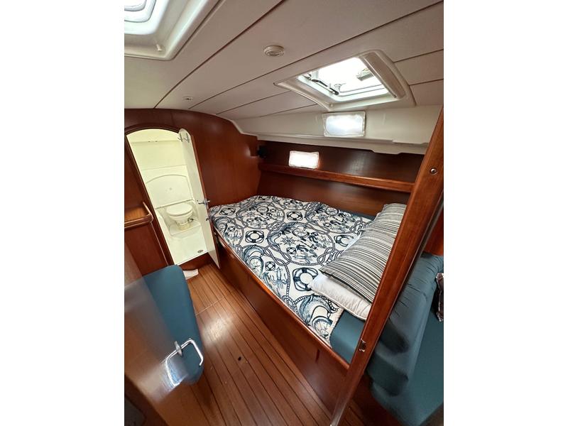The Beneteau 411, designed by the renowned Groupe Finot, exemplifies a true marriage of performance and beauty. With the bulb / fin keel, maximum stability and efficiency on all points of sail are achieved by her low center of gravity. The standard in-mast furling main and roller furling genoa provide efficiency and true ease of handling. The large cockpit with teak inlay seats is designed for maximum comfort and the pedestal console allows ample space to install electronics. There is also a dual-leaf cockpit table containing a large molded storage area and plenty of space to stow gear in the large cockpit lockers. The extra-wide aft swim platform and ladder, walk-through transom, and standard cockpit shower makes swimming easy and convenient. Both the two- and three-cabin layouts have roomy companionways, large cabins, and plenty of storage throughout, all accented with richly detailed cabinetry. Specially designed for serious cruising, the 411 nav station has a large chart table with additional locker storage underneath, as well as ample space for installing electronics. The deluxe forward owner's stateroom features a generous double berth and an upholstered port settee that is perfect for reading or relaxing. There is also private access to the spacious forward head with sink and shower unit. The galley is beautifully appointed with pressure laminate countertops, double stainless sinks, and loads of storage. The two-compartment refrigerator / freezer has top and side access, and the two-burner propane stove with oven will accommodate every culinary need. |