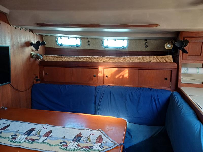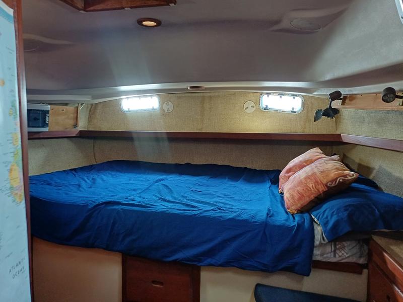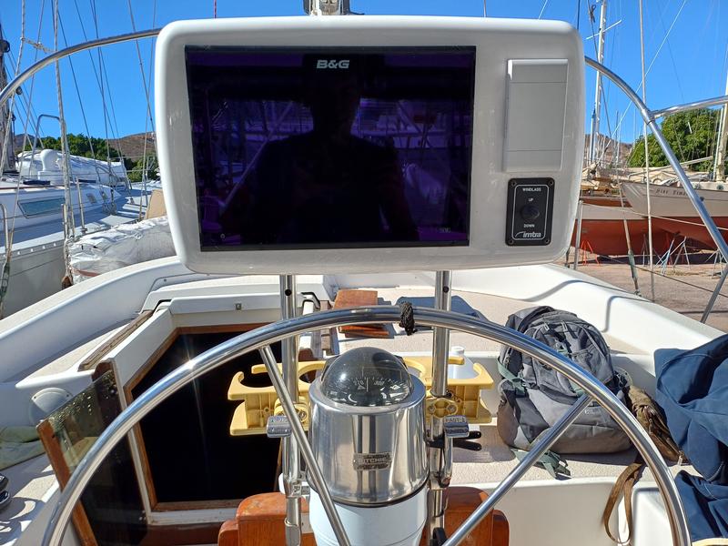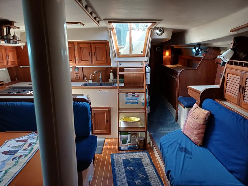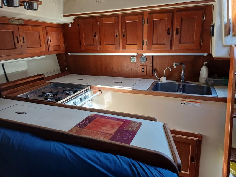 Electronics: GPS B&G 12 multifunction Display New 2021 Sensors Wind B&G WS310 New 2021 VHF Standard Horizon New 2021 Iridium Go Satellite communicator New 2021 Autopilot Simrad NAC-3 Core Pack New 2021 EM-Trak Class B AIS transreceiver New 2021 Radar Raytheon Radio Soundpex with MP3 Compass Galley: U-shape galley to starboard of the companionway Refrigeration/freezer in two separate holds: Adler Barour New 2023 stove/oven: Sea ward Princess 3-burner propane in excellent condition Water heater: Isotemp 5.4 gallons (2014) Double deep SS sink Pressure H/C water Deep storage cabinet integrated into generous counter space Cabinetry also includes custom teak wine glass holder Electrical (1) 12v engine start battery, (8) 6v 880 amp hour house batteries New 2021 12v DC and shore 120V AC 30 amp Alternator 14.4 90amp New 2023 Battery Monitor: Victron BMV Bluetooth with smart shunt New 2022 Xantrex Inverter Charger (2500 watt 45 amp) mounted on the forward wall of the engine room Solar Panels: (2) 455 watt arch-mounted New 2021, (2) 130 watt rail-mounted -Wind Generator: Aleko 250 watt 5-blade Solar and Wind Controller: Tristar 60 amp, Victron SmartSolar 70amp New 2021 All interior lights changed to LED