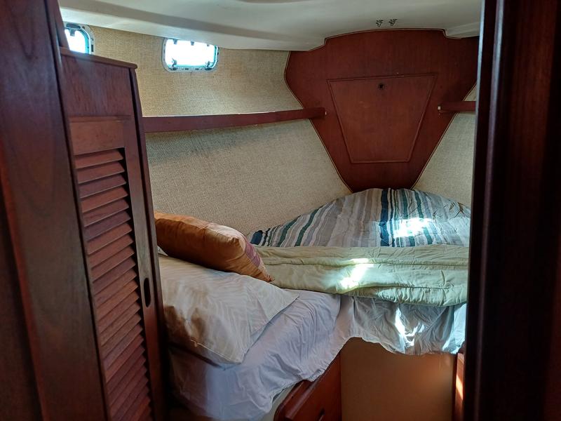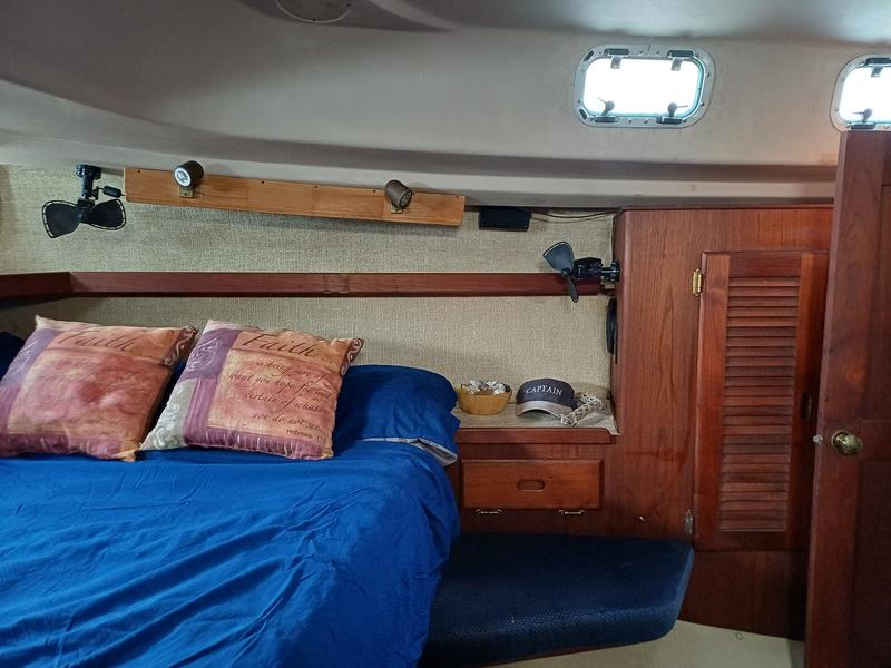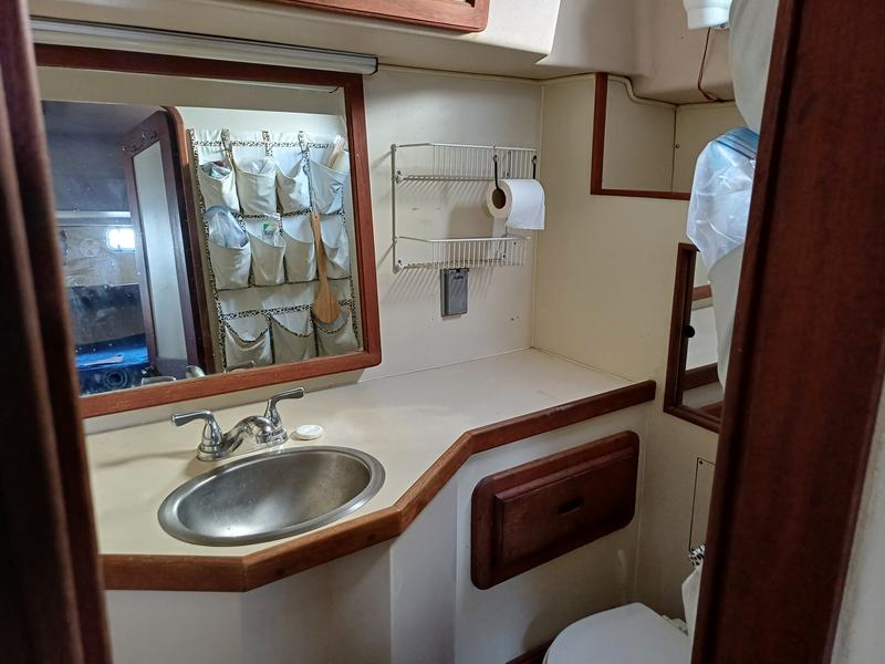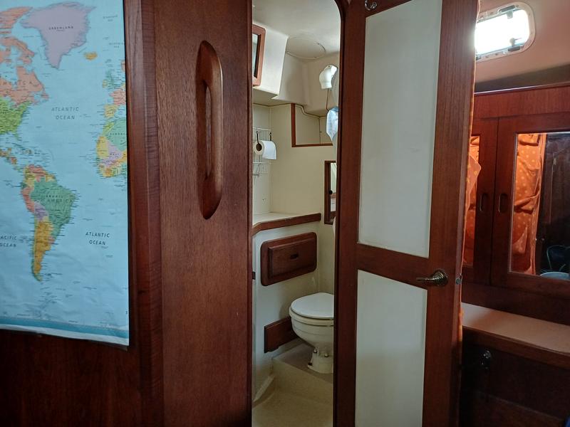 Engine room has great access from walkthrough and workbench, making it visible and accessible Raw water sea strainer Yanmar and Racor (with shutoff) fuel filters Dripless shaft seal (PYI) Prop shaft carrier and cutlass bearing replaced 2013 Rebuilt fuel injector pump and injectors cleaned 2012 Bilge Pump: Automatic 3700 and 2000, one manual Bilge blower Fire Extinguishing: Auto Halon Fuel shut off: Stove and engine Fresh water cooling Heads: Head 1 forward Electric, Head 2 aft Jabsco 2016. Both heads with Y-Valve for selecting holding tank Holding Tanks: Forward 10 gallons, aft 10 gallons Heater: Wallace (not connected) mount to engine room starboard wall Additional information: Solar and wind controllers are located to pot of the aft cabin, with a monitor in galley. Wired in combination from solar and wind generator through the aft section of the engine room. Secondary water and diesel tanks mounted in starboard side of engine room SunPure watermaker 12v 8-12gph New 2021 Primary watertank was converted to storage 2021 Safety: Lifejackets Lifesling Jacklines |