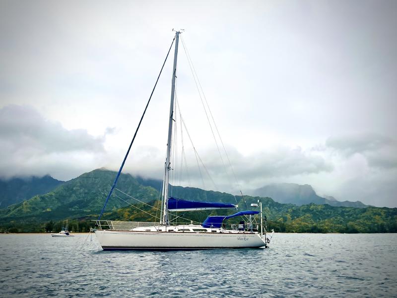 Anchoring Sarca Excel 47 lbs main anchor with 80 feet of chain and 120 feet of nylon rode Fortress FX 23 aluminum kedge with 10 feet of chain and 200 feet of nylon rode Lewmar windlass (not working)
