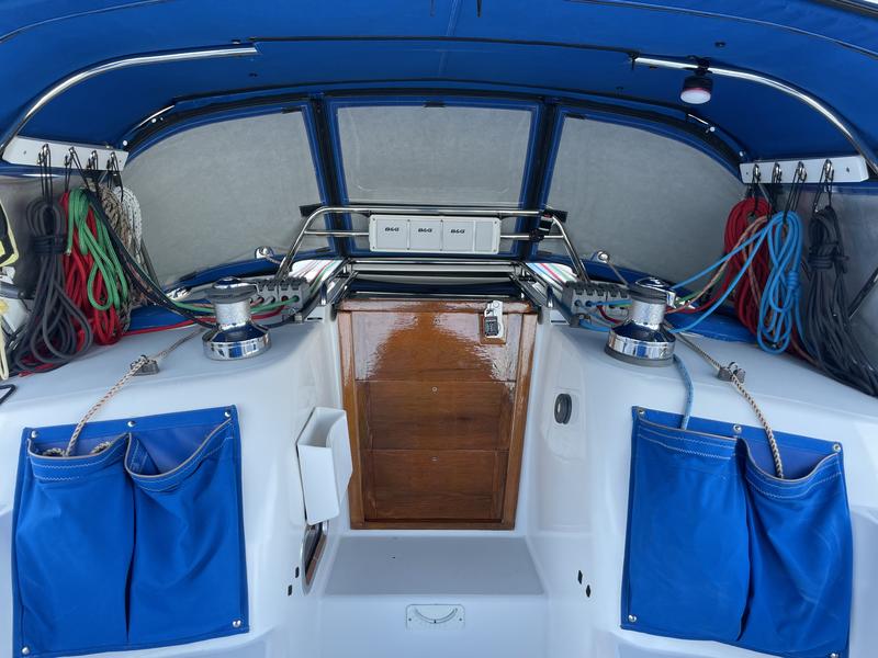 Rigging and Deck Gear Rod rigging replaced 2022 with complete rig inspection 2025 All running rigging replaced between 2000 and 2025 with HMPE double braid halyards and running backstays and Dacron double braid sleets and control lines. DUX removable inner forestay, boom end preventers, running backstays and mast spinnaker pole track installed 2022 Forespar J-length carbon spinnaker pole Hydraulic backstay rebuilt 2022 2 Lewmar Ocean 58ST primary winches, 2 Lewmar EVO 35 secondary winches, 2 Lewmar 44ST cabin top winches (starboard winch electric) Antal Mast Track and Luff Hardware Custom heavy duty boom bales installed 2022 HMPE lifelines with C. Sherman Johnson Spliceline fittings installed 2021 Spinlock clutches on mast and Lewmar clutches on cabin top 2 Lewmar 10 inch PowerGrip and 3 standard winch handles