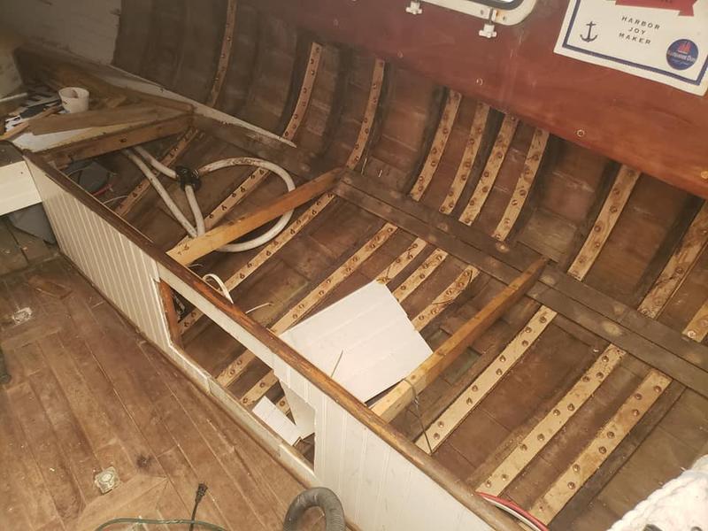 Hull: White cedar on oak frames. Originally fastened with bronze ship nails, refastened below the waterline in 2000s with bronze square drives. Sistered frames below the cockpit (2000s)and starboard side above the waterline with laminated oak sisters 2023. External lead ballast bolted through keel 1965. Rudder and shoe replaced 2018. Entire hull recaulked and seam compounded 2000s and following seasons as needed.