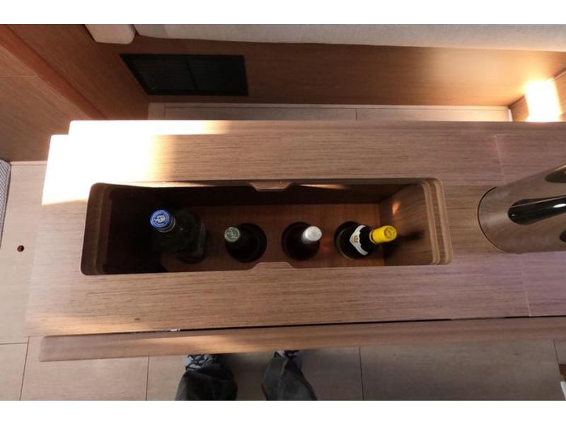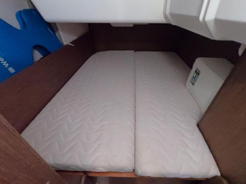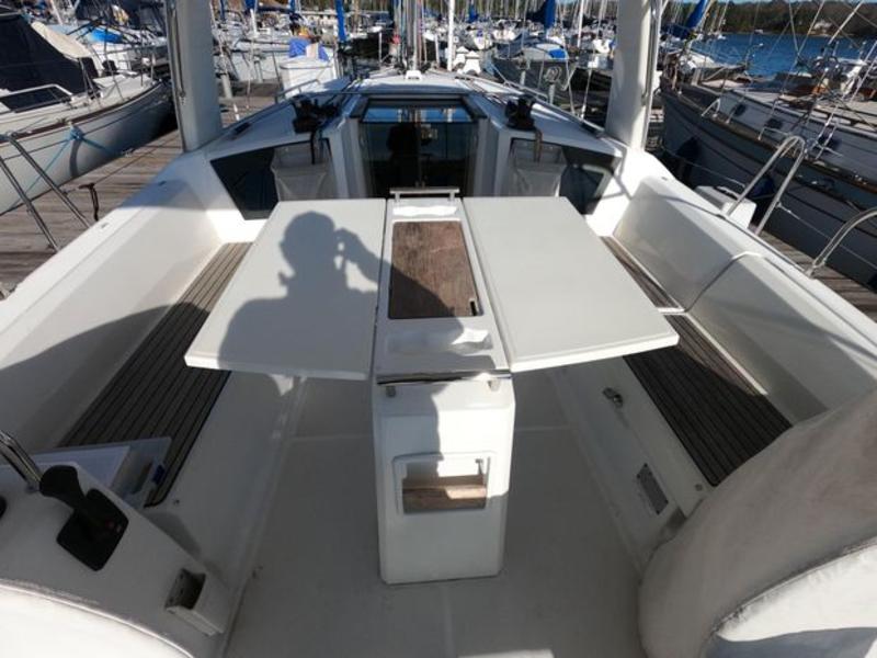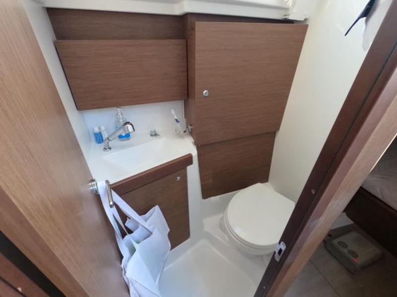 Accommodations Beautiful large private V berth forward with lots of storage Main cabin has opposing settees with large drop leaf table seating up to eight Fold down navigation table to starboard with full electrical panel Flat screen TV, Stereo, Air Conditioning, Inverter, Shore Power, 12v Very nice L shaped galley to port of companionway with SS sink, propane stove with oven, microwave and refrigeration Two large private double cabins aft with hanging lockers Head with sink and shower Cabin has very spacious modern feel with quality finishes