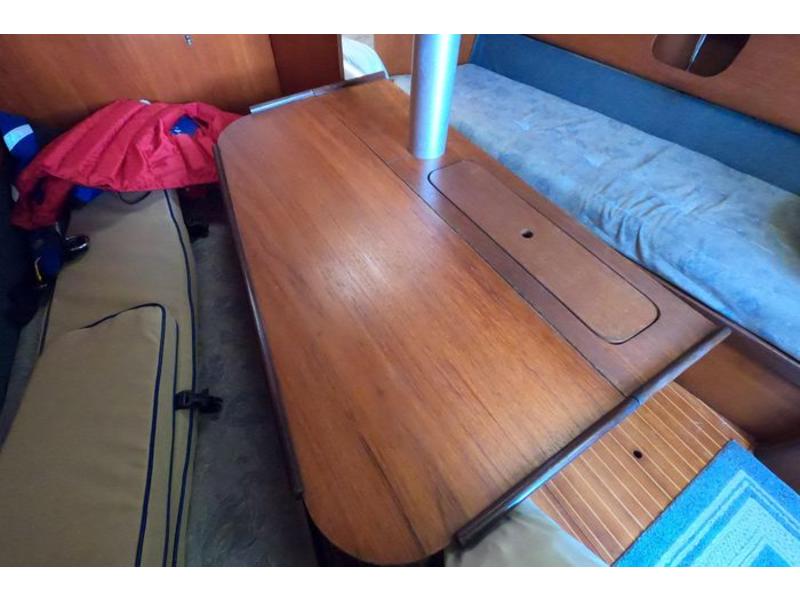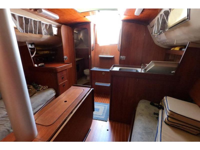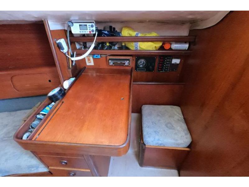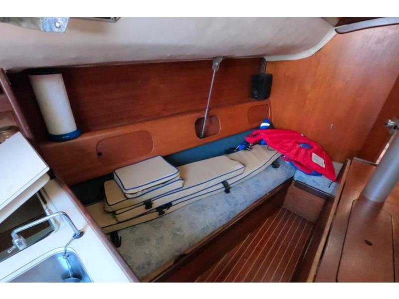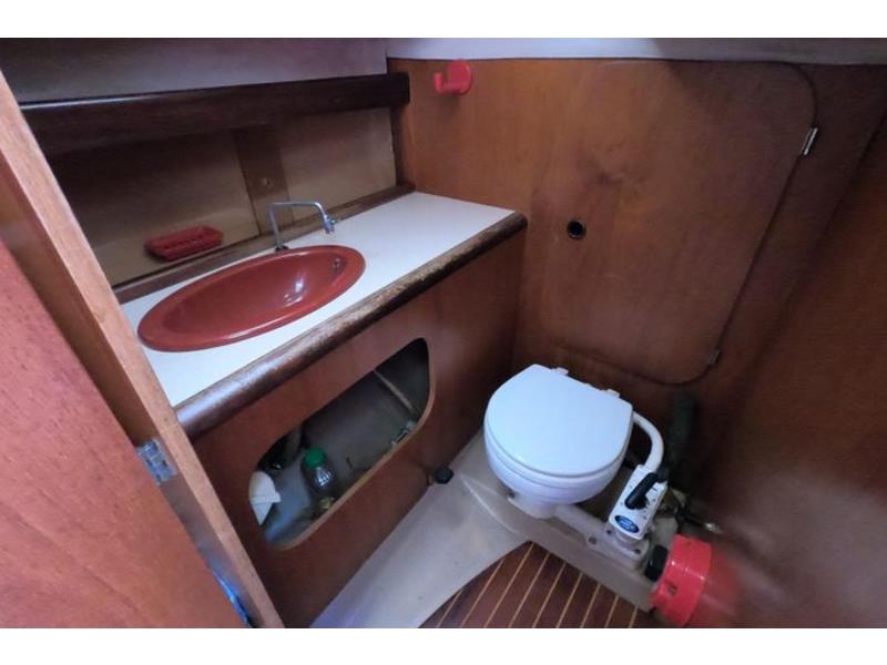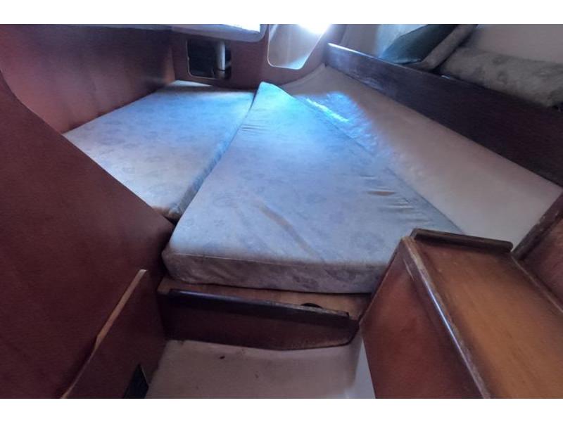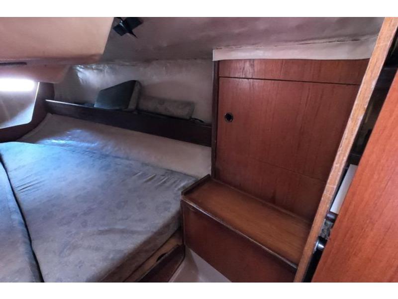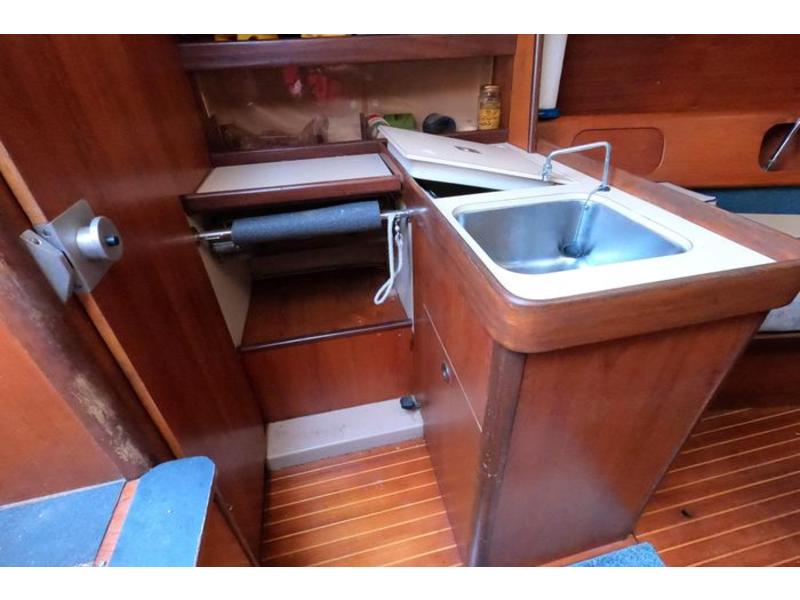 Three cabins, head & holding tank. Two burner alcohol gimbled cooktop, sink w 25 gall water