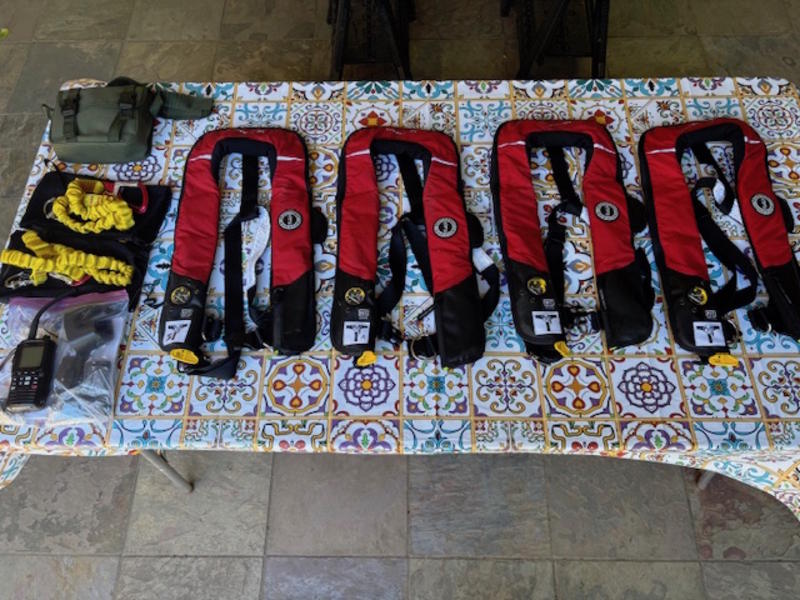 Like New Accessories: 4 Mustang Survival Hydrostatic Inflatable Life Jackets (Value $1200), Aomekie Waterproof Binoculars (Value $100), Standard Horizon HX890 Floating VHF/GPS (Value $200), 2 Fall Protection Lanyards. Also includes seat cushions, bilge pump, anchor, and sailing books. |