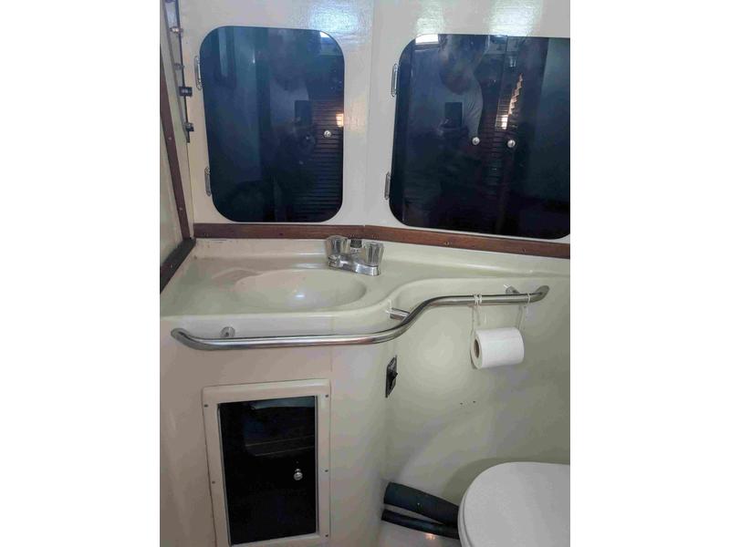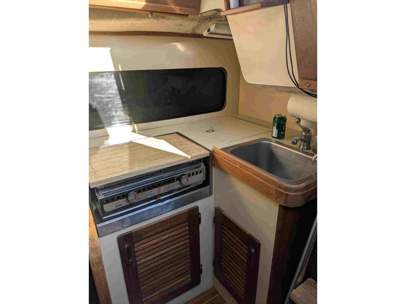 Galley includes a newer two-burner alcohol stove, sink, storage, and large icebox.