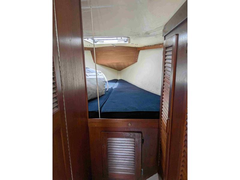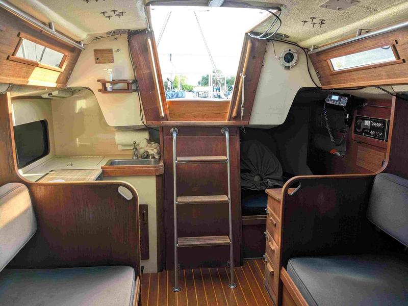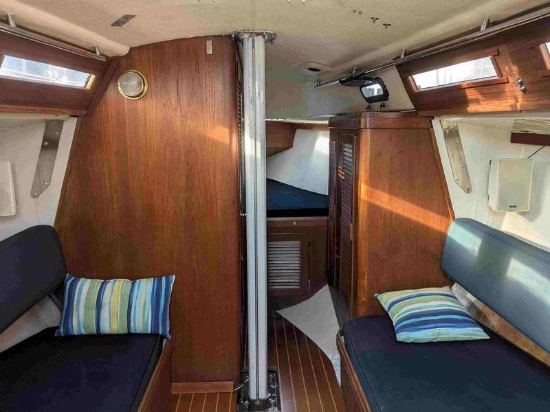 Spacious layout with vee berth forward, quarter berth aft, and two settee berths in the main salon (equipped with lee cloths).