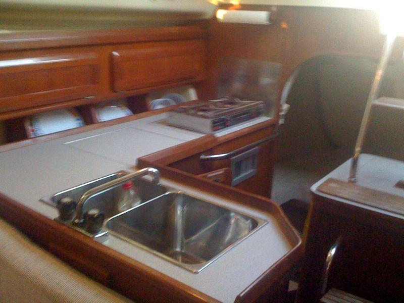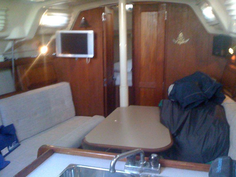 Forward V berth cabin. Aft of main bulkhead is the main salon with port settee and starboard dinette. Aft in main salon to port is the navigation station, to starboard is the galley. Head & shower port side (needs new shower head). One aft cabin (athwartships bunk) below the cockpit.