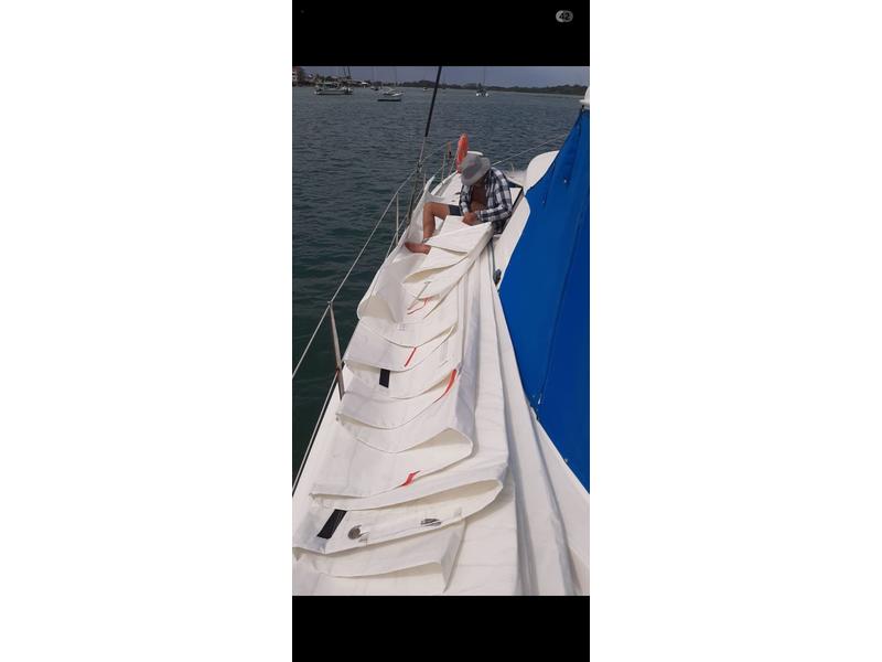 Belize 43 Mainsail Two ply leech Contender Charter 8 oz body 6oz 2nd Ply 6 battens full 3 Reef points 6,350.00T Belize 43 Roller Furling Genoa, Contender Charter 9 oz Options included UV cover Sunbrella Grey Tenara thread on the cover. 2,870.00T Lazy Cradle Sunbrella Grey Tenara thread |