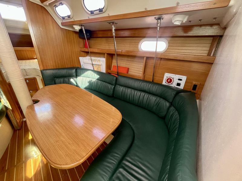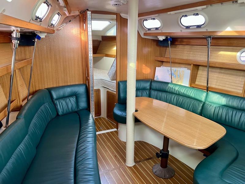 Salon Dining Table w/ Wrap Around Bench Seating - Starboard Convertible Dining Table - Double Berth Bench Sofa - Port (possible single Berth) Teak & Holly Flooring Navigation Station w/ Chart Light & Storage Ample Storage, Lighting & Ventilation |