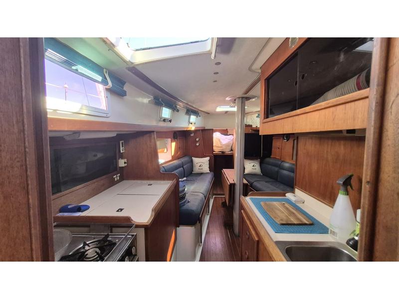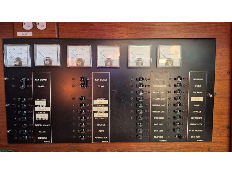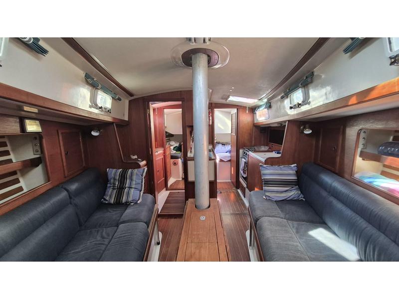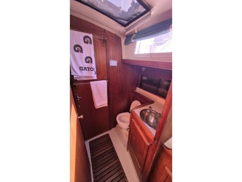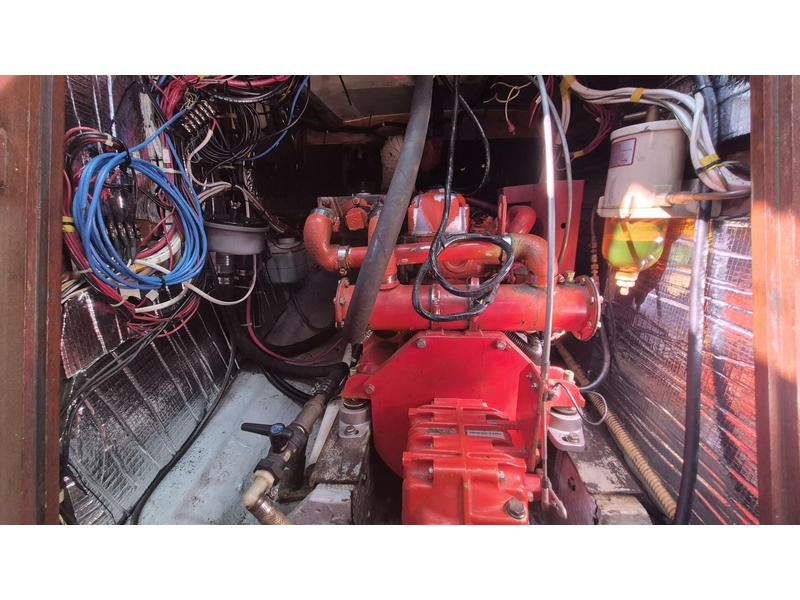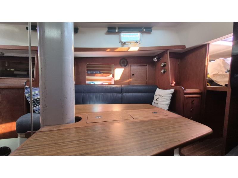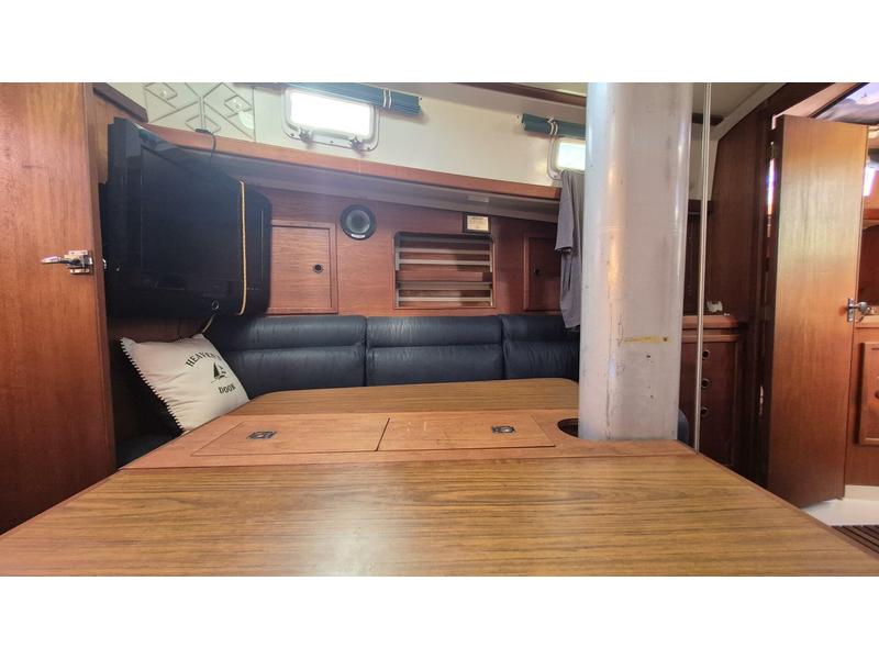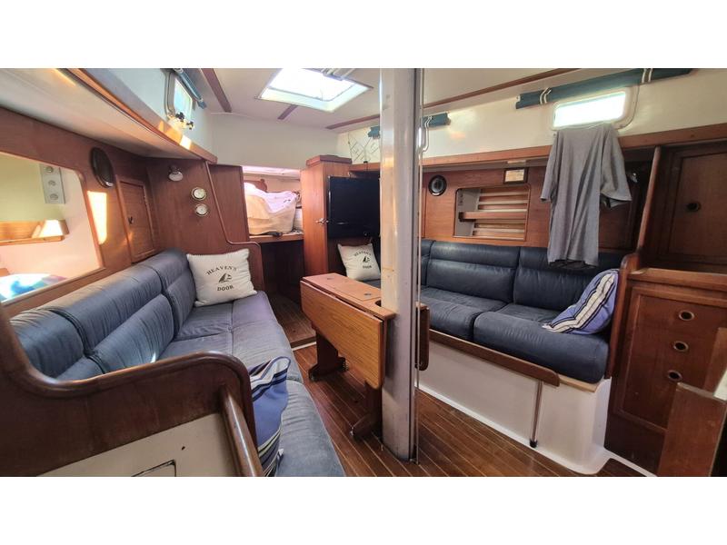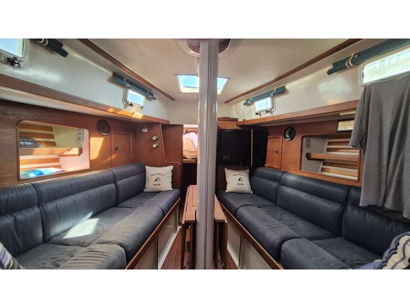 Accommodations: Bright and well-ventilated interior with 64 headroom throughout Forward V-berth with privacy door and ample storage Large main salon with opposing settees (convertible to additional berths) and centerline dining table Starboard-side navigation station with full-size chart table and electronics space Aft quarter berth (can also serve as storage, workshop, or equipment bay) Numerous opening ports and deck hatches for airflow Warm wood finish and classic teak trim throughout
