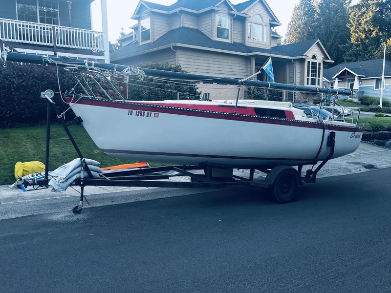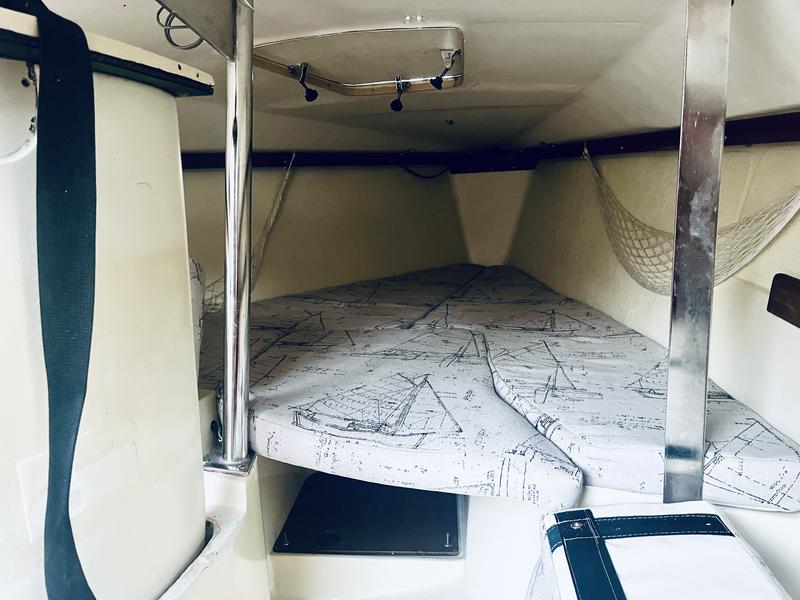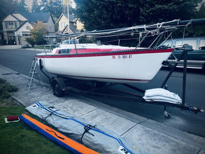 Doyle mainsail (new, 1 season) Doyle genoa (new, 1 season) Storm jib (new, Sailrite) Spinnaker (Ulmer Kolius, fair) Original Horizon main and Ulmer genoa (fair) Sail storage bags (Doyle) Custom red mainsail cover Spinnaker launching bag A-frame mast raising/lowering rig Spinnaker pole Running rigging (updated) Custom sailboat-themed cabin cushions (settee V-berth) Dock lines, mooring lines, and matching red fenders Anchor with chain and rode Boat hook Safety gear: 4 PFDs, fire extinguisher, sound signaling device Navigation lights Manual bilge pump, bucket/bailer, backup paddle/oar Tool kit and spares Outboard motor (non-working) 1985 single-axle trailer (good bearings, lights, winch) |