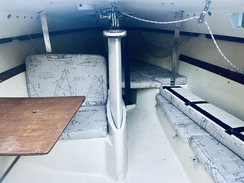 Equipment includes A-frame mast raising/lowering rig, spinnaker pole, updated running rigging (last 23 yrs), custom sailboat-theme cabin cushions, anchor, dock lines, fenders, boat hook, bilge pump, 4 PFDs, fire extinguisher, nav lights, and tool kit.