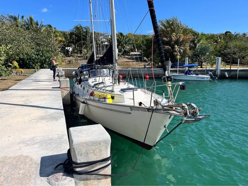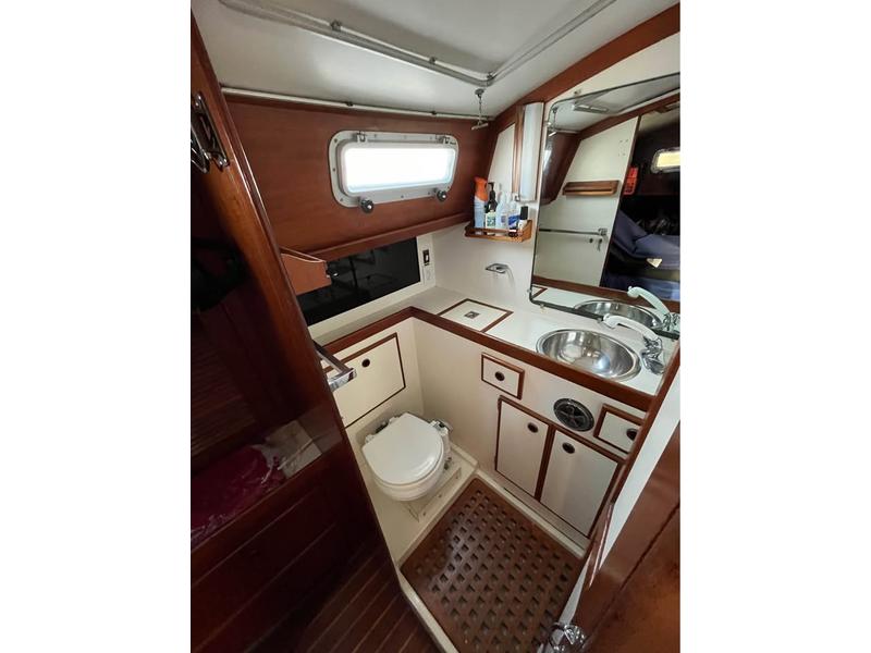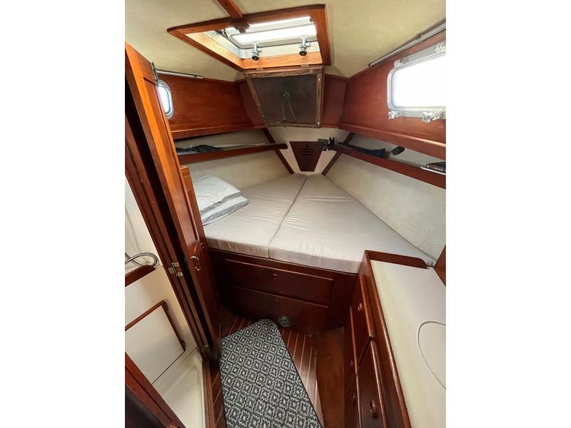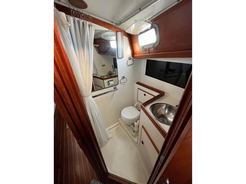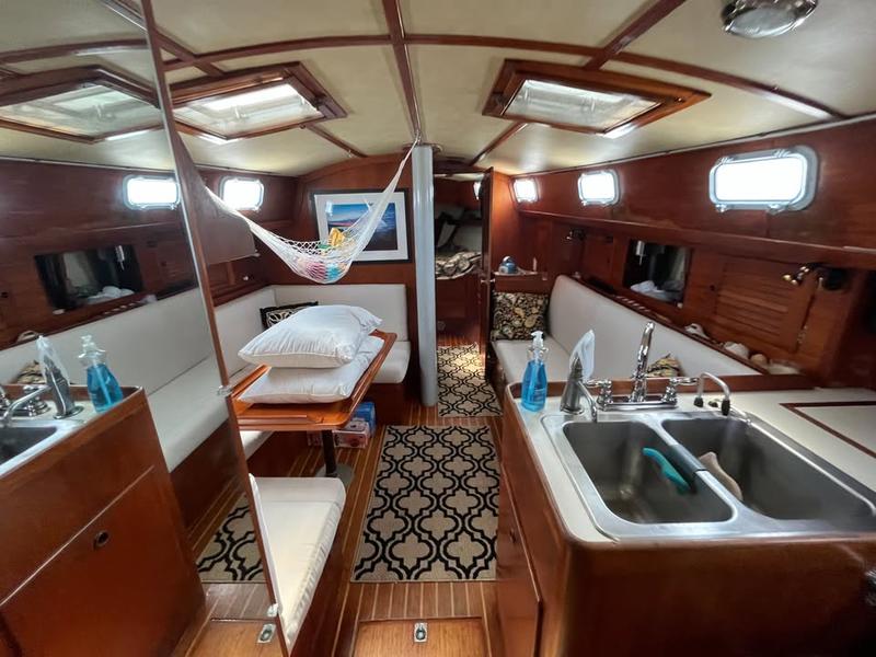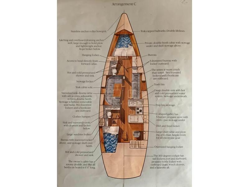 She is the very rare "C-Plan" cabin layout. She sleeps 6 - two in her forward v-berth (modified queen), two in her private aft cabin (modified full) plus two in the salon. The starboard salon berth has a lee cloth and is a wonderful sea berth. She has two full heads with engine-driven hot water.