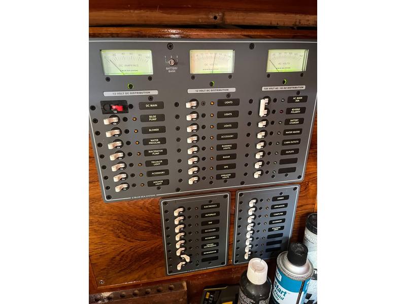 She was professionally rewired from stem to stern in 2021 by Dutch Wharf in CT with brand new BlueSea systems electrical panels and NMEA backbone. She includes a 500 amp hour lithium battery bank and 700 watts of solar. She has a 3000 watt inverter to power all the comforts of home including a microwave, toaster, keurig, icemaker, computers, Starlink, etc. etc. etc. All of her systems are Victron and are intergrated through a Bluetooth app. Her batteries are also Bluetooth enabled so you can monitor power in and out, battery state, etc. |