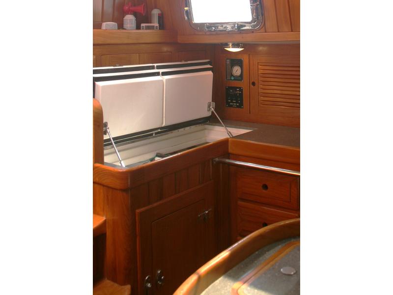 The Cabo Rico 42, designed by Chuck Paine, was awarded Sail Magazine's "ultimate bluewater boat" prize in 2000 and was named one of the top 10 best sailboats in the world -the only boat to meet their definition of an ultimate bluewater boat. Elation is one of the last Cabo Rico 42s built and lives up to her name and reputation handling with an incredibly smooth and gentle motion on all points of sail. She is equipped with a Schaefer roller furling boom, new Schaefer genoa and staysail furlers and Lewmar electric winches for easy solo or couple sailing. Elation has been gently sailed, well maintained and fully equipped for bluewater cruising with up to date electronic systems. She is being offered by her second owners in time for the southern migration. Accommodations Straightforward in layout, the overall feel of the interior is one of useable comfort. The designer interior is beautiful, rich, plantation grown Costa Rican teak. Twelve opening ports plus a large forward hatch and extra-large main hatch, all with screens, combined with fans throughout ensure Elation stays cool through the hot months with air conditioning needed only when docked where there is minimal air flow. There is 66 headroom throughout the cabins. The aft cabin has a double bed, hanging locker, multiple shelves and drawers with additional storage under the berth. The forward cabin has a large V-berth with ample storage, drawers and storage spaces under the berth. A hanging locker is just outside. The head features a separate shower, teak medicine cabinet and Raritan head. The main cabin features a settee to starboard that converts to a double bunk. Lockers with louvered doors line the salon. The navagation table is compact. Instruments are easy to read and the electrical panel is well labeled and user friendly. The galley is complete with plenty of storage for food and dishes. 3 Burner Force 10 propane stove with oven and broiler and a microwave make cooking a joy. The countertops in the galley and head are Corian. |