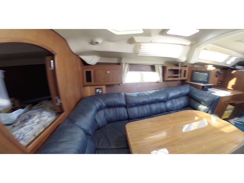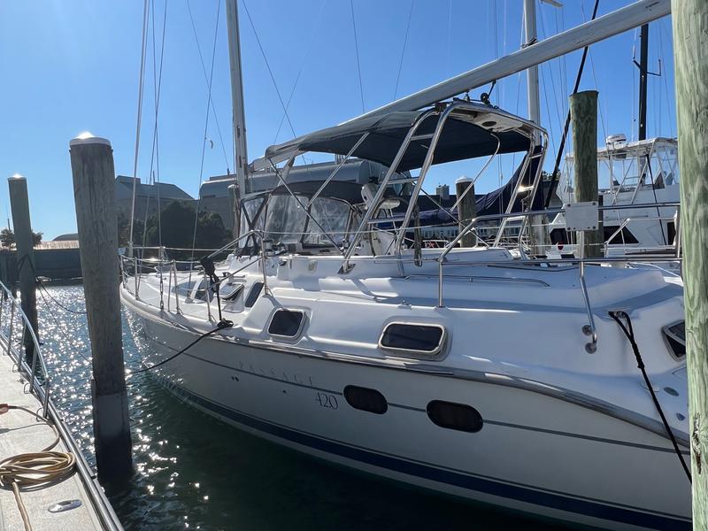 Designed for recreational use, the Hunter Passage 42 features spacious sleeping quarters for four with fore and aft staterooms. Accommodations can be increased to six or more with the settee and dining table in the saloon that convert into a double berth. The cockpit, though not overly spacious, is ideal for socializing and protected from the weather by high sides, a dodger and bimini. The side decks are wide for safe and efficient movement of the crew. The stern boasts a walkthrough transom, swim platform, and a boarding ladder that folds. Foodies tend to gravitate to the well-equipped galley. And when time comes to service the engine, gaining access isnt a challenge. For more information or to see the video, text or call the number below. |