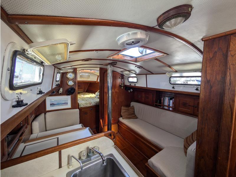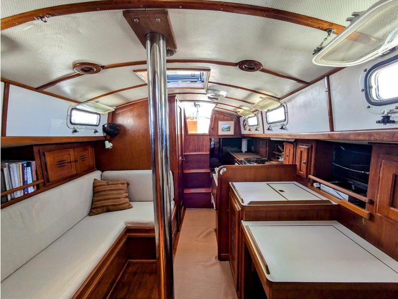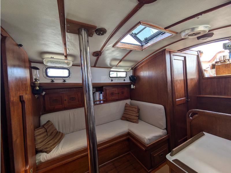 The main salon includes a port navigation station and a starboard settee with a folding bulkhead-mounted dining table that converts to a double berth. Excellent ventilation from two opening ports per side and an overhead hatch. Storage behind and beneath the seating plus a large custom cabinet aft of the nav station.