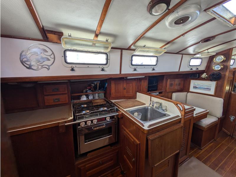 To port, the galley features a deep stainless sink with hot/cold pressure water and foot pump, Dickerson 3-burner propane stove with oven, large refrigerator with spillover cool box, dry storage, and multiple lockers for provisions.