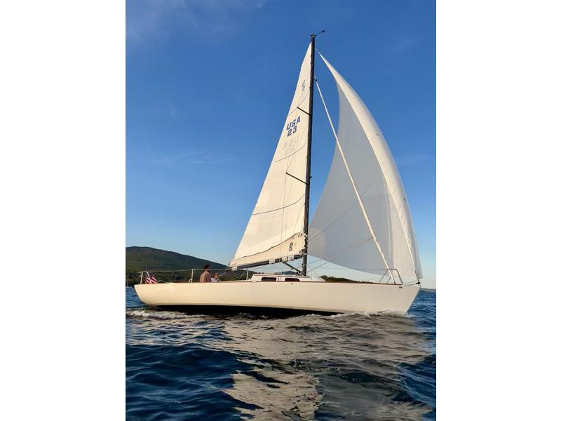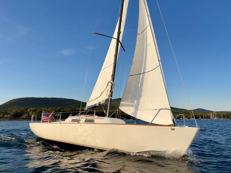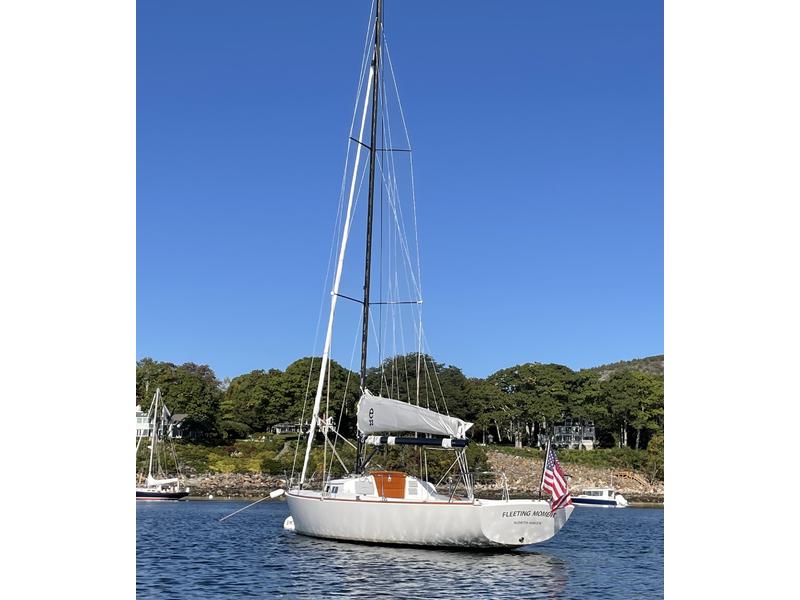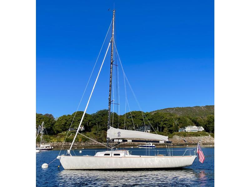 Fleeting Moment is a truly fine example of an e-33, one of the best performance daysailors you could hope to sail. She has been serving her sole owners exceedingly well since her 2011 launch, sailing the waters of the Fox Islands and Penobscot bay as a professionally maintained family daysailer. The e-33, developed by E Sailing Yachts founders Robbie Doyle and designer Jeremy Wurmfeld with a goal of usability, comfort and performance. Their vision was executed in the highest quality by the builders at Lyman-Morse in Thomaston Maine. The result is the perfect Grand Tourer of the yacht world. Incredibly comfortable, stable and safe for guests, she inspires confidence in all who enjoy her. She also is a high performance race boat, a performance level which is incredibly accessible to anyone who takes their turn at the light and balanced helm. Not to mention she is beautiful whether healing under sail, or sitting on the mooring. This boat's design was all about solutions, never a compromise. These thoughtful solutions are clear at every glance. Fast, efficient, and stable begins below the waterline, with a keel design that slopes slightly aft to reduce catching lines, and a large efficient rudder. Above the water, the topsides shine with luster and a beautiful, subtle sheer and cabin trunk line, all complimented with the perfect amount of varnished teak. The cockpit stretches an expansive 16 with ample seating for 6 in the working cockpit and two additional lounging on the cushioned aft deck. The Seldon Spars carbon masts backswept spreaders eliminate the need for a backstay, paired with aluminum boom with internal advantage for macro and micro sheeting, as well as for the one line reefing, provide intuitive and simple sail control. No winches are needed for trim and tacking. All sails are in perfect condition with annual service and cleaning. A Navtec system for controlling the hydraulic headstay tensioner sits in the cockpit and allows for easy and precise mainsail trimming. Below, four efficient berths and a plumbed marine head, provide simple a |