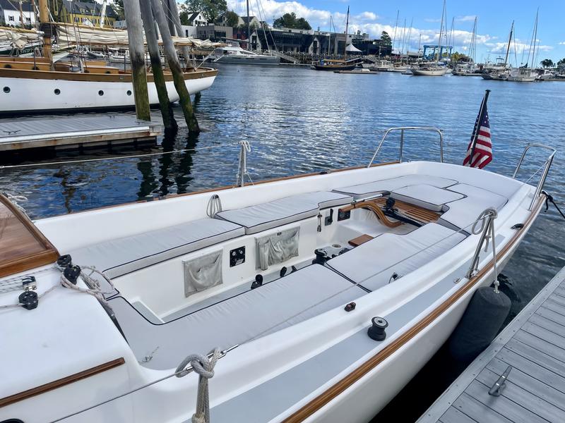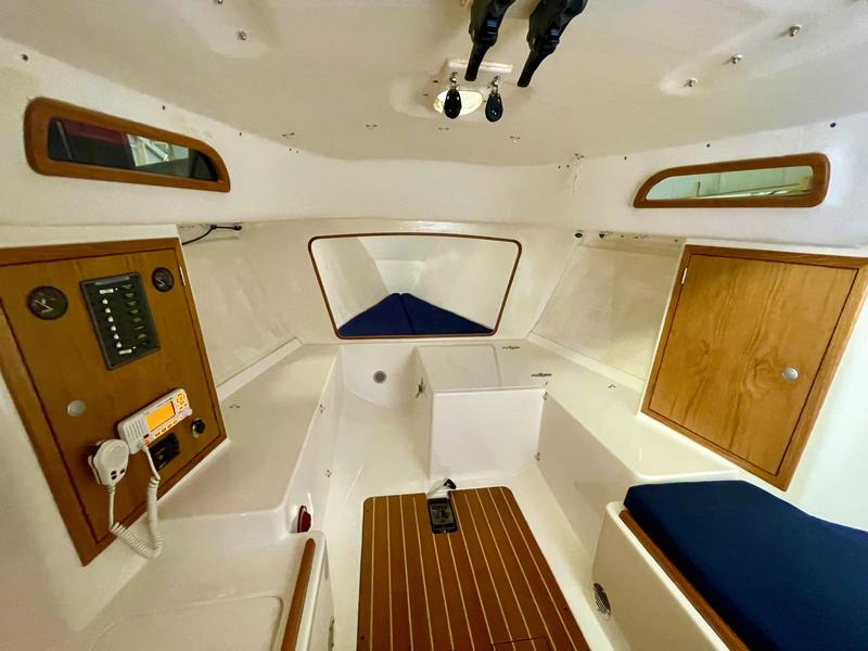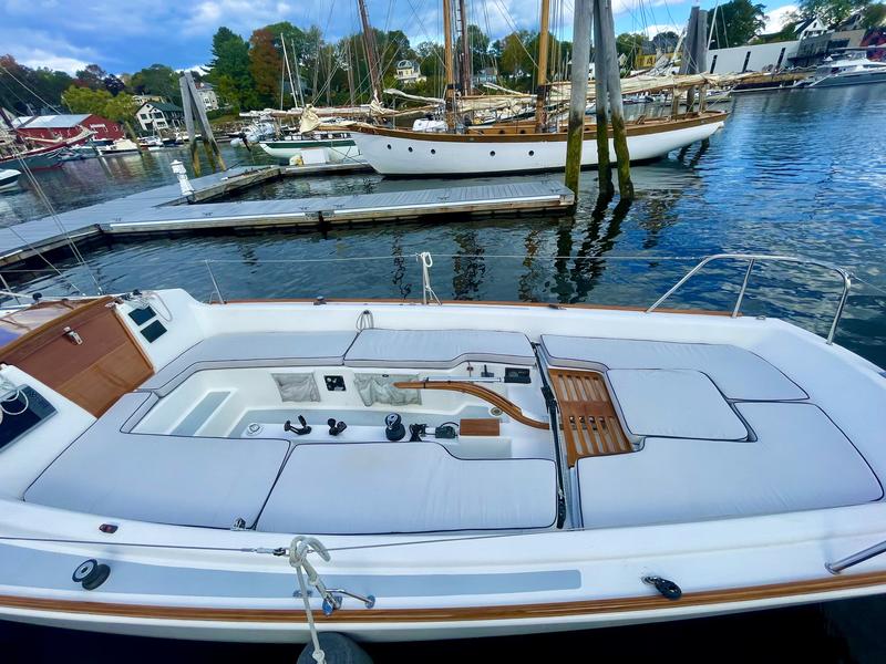 Cockpit Likely the finest cockpit youll ever find on a day sailor! Including expansive seating for 8 in comfort with room for 6 sailors or guests up forward and access to helm and lines with room for at least 2 to lounge on the aft section. The sheets and jib furling line comfortably lead to the cockpit and tiller for easy single handing or easy sailing with guests. Halyards route to clutches under the coach roof with fairlead to the single winch in the cockpit. Beautiful teak features including the beautiful centerpiece of the companionway and large sliding hatch, to the light and perfectly sized varnished tiller, and the varnished grate covering the tiller head. There are lovely custom touches throughout, including a varnished foot rest telescoping up from the centerline. There are light gray cushions accented with dark blue piping. The cushions attach using an integrated rope and flex track system, that allows them to stay secure even if the rail dips in a breeze.