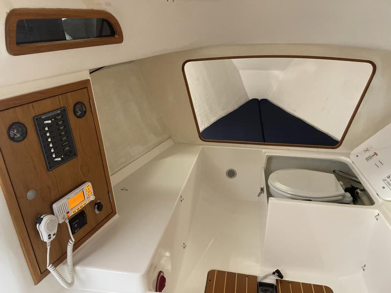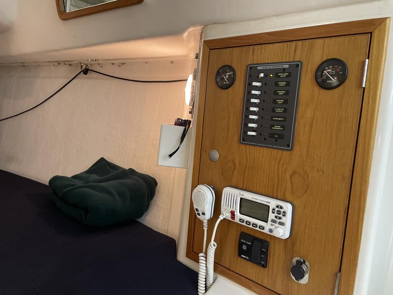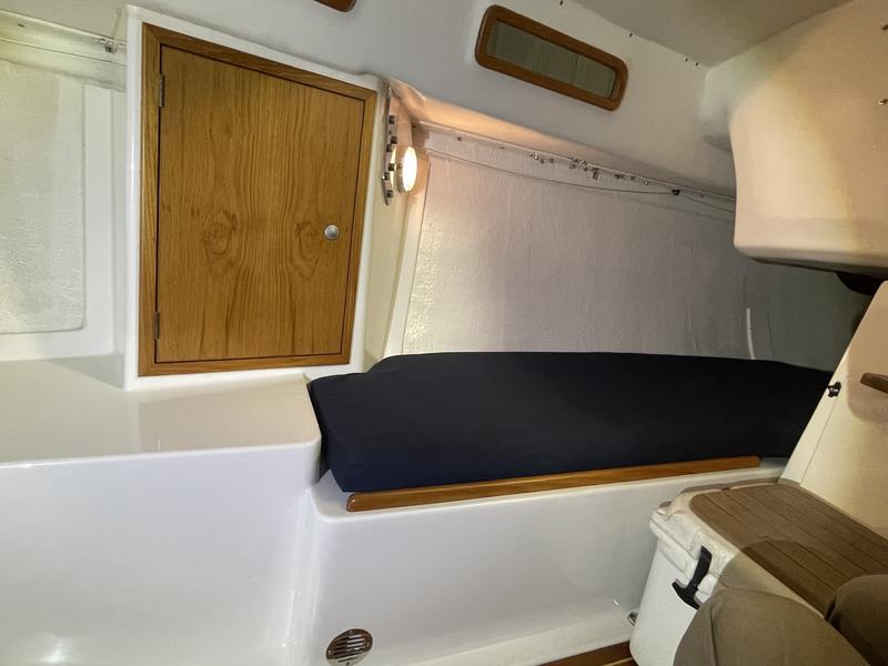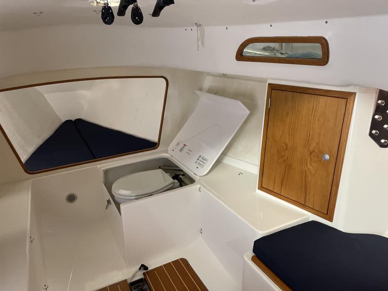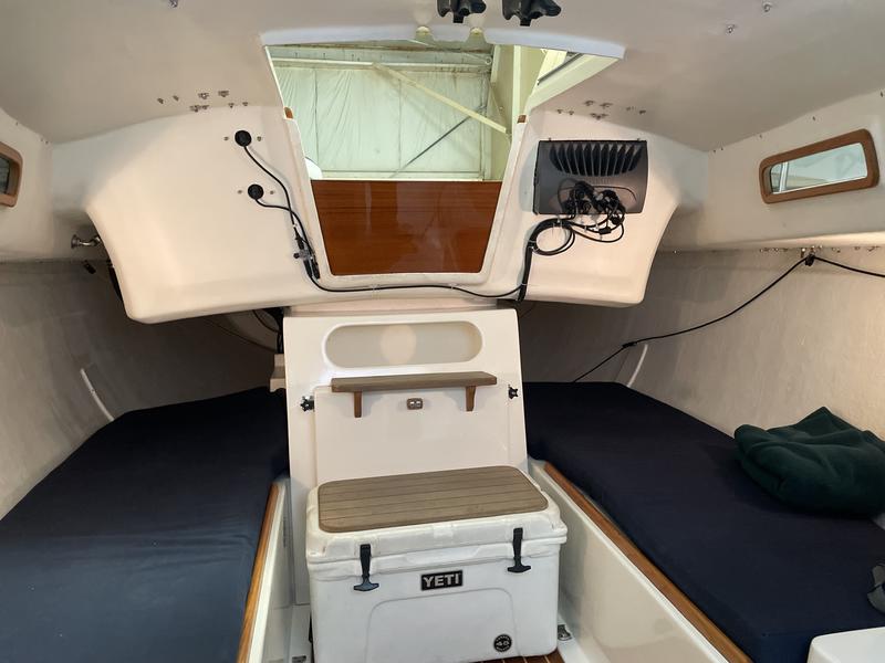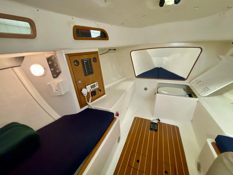 Accomodation She has a V-berth forward with a holding tank and storage below. Moving aft, you will find marine head to starboard with a discrete compartment and privacy curtain. There are pilot berths to port and starboard of the companionway with terrific engine access in the center below the companionway. Cushions are dark blue colored Sunbrella on the 4 berths. There are light gray cushions accented with dark blue piping. The companion way step doubles as Yeti cooler with custom teak treads on top.