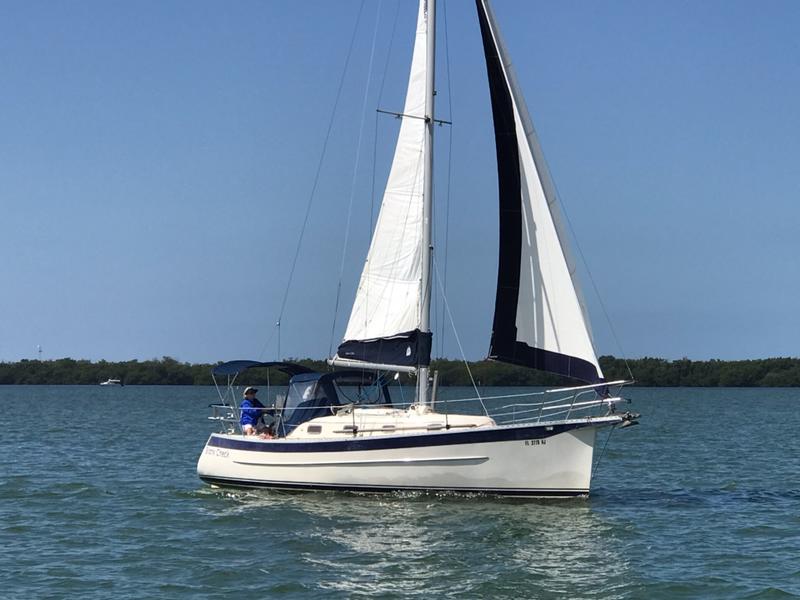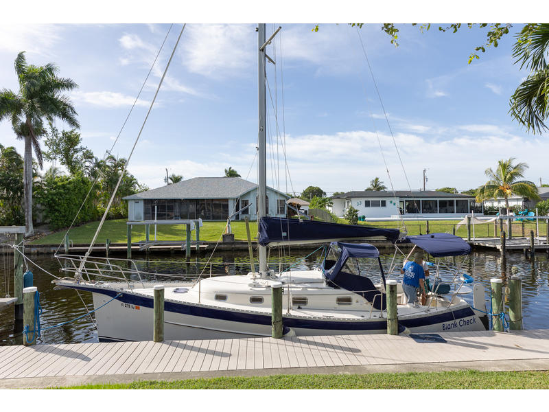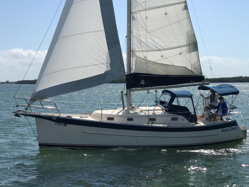 Retracting keel: The electric winch-operated keel, tipped with a lead bulb, can be lowered for stability and performance or fully retracted to a shallow draft of around 20 inches, making it easy to trailer, navigate shallow areas, or even beach the boat. Retractable rudder: The transom-mounted rudder also lifts, providing full shoal-water capability. Performance: With its keel down, the 32RK is a capable and stable cruiser, engineered for agility and upwind performance. It has a displacement of 8,300 pounds and carries 2,400 pounds of ballast. Engine: The boat is commonly powered by a 30 hp Yanmar diesel engine. Deck and cockpit: The deck features a masthead sloop rig with a bowsprit. The cockpit is large and comfortable, with a walk-through transom, swimming ladder, and a freshwater shower.