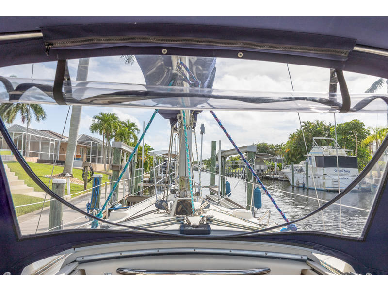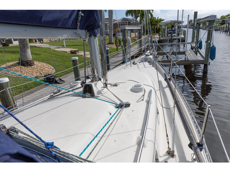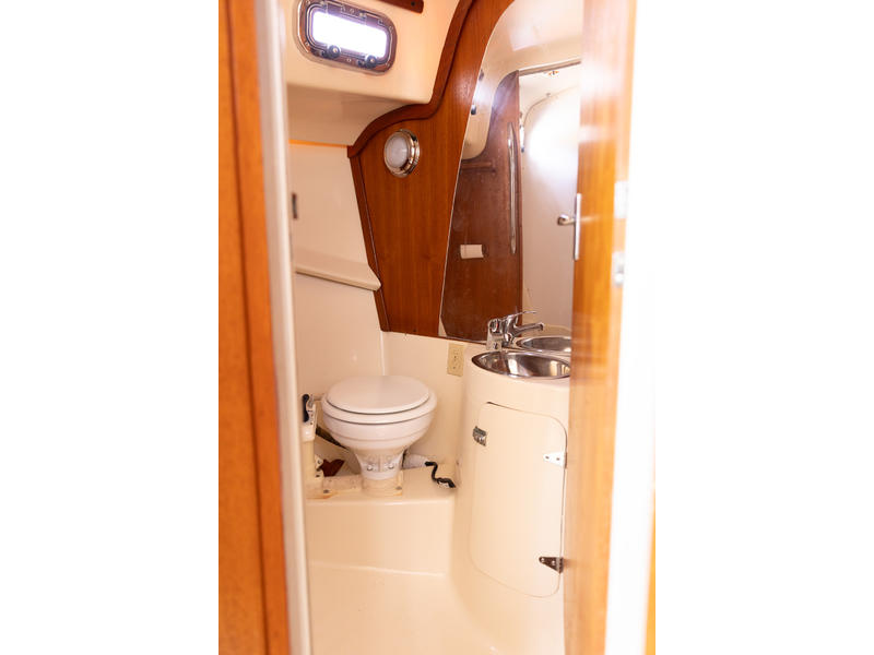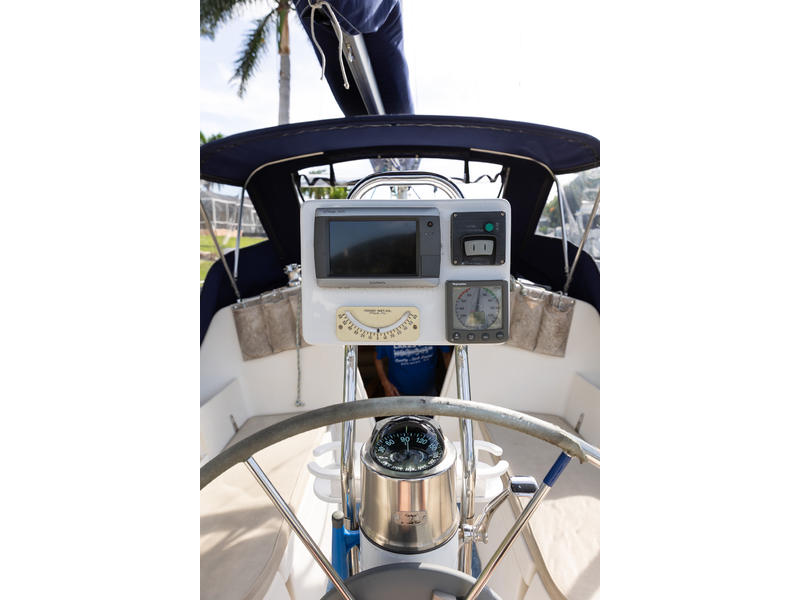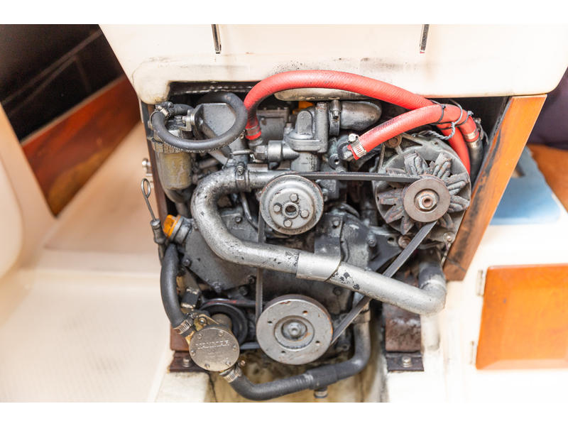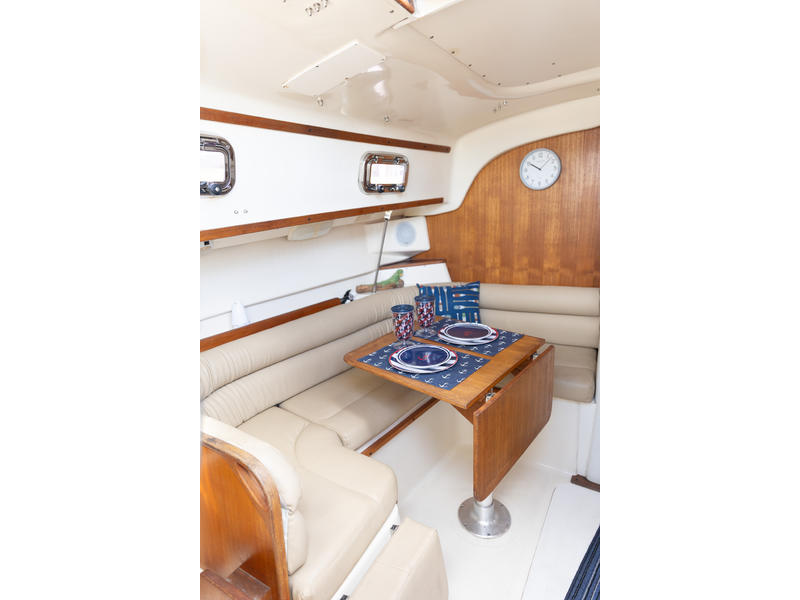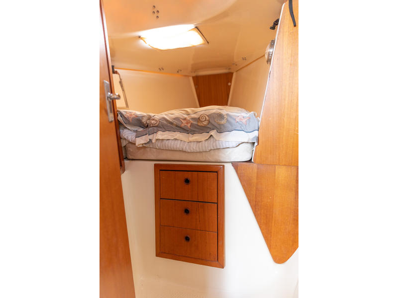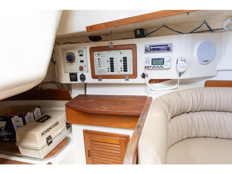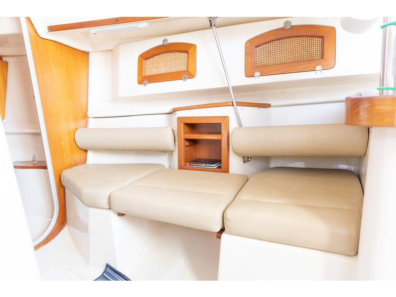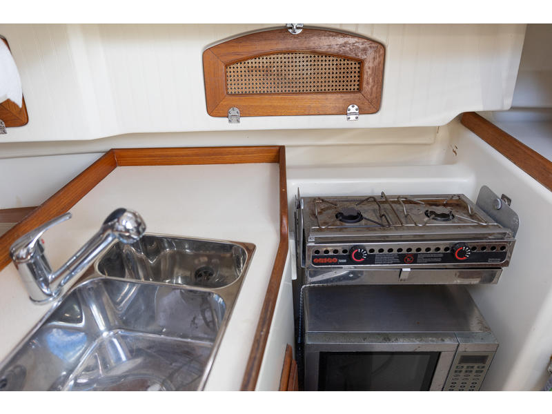Sleeping capacity: Sleeps up to six people with three double berths. Layout: Forward cabin: An enclosed V-berth offers a double berth with ample storage. Saloon: A U-shaped dinette to port can be converted into another double berth. To starboard is a settee that can function as seating or an extra child's berth. Aft cabin: A double quarter-berth is located on the port side, tucked under the cockpit. Galley: An L-shaped galley on the starboard side includes a two-burner stove, a double sink, and a refrigerator. Head: The enclosed head compartment is to port, and features a manual toilet, sink, and separate shower stall. Navigation station: A dedicated nav station |