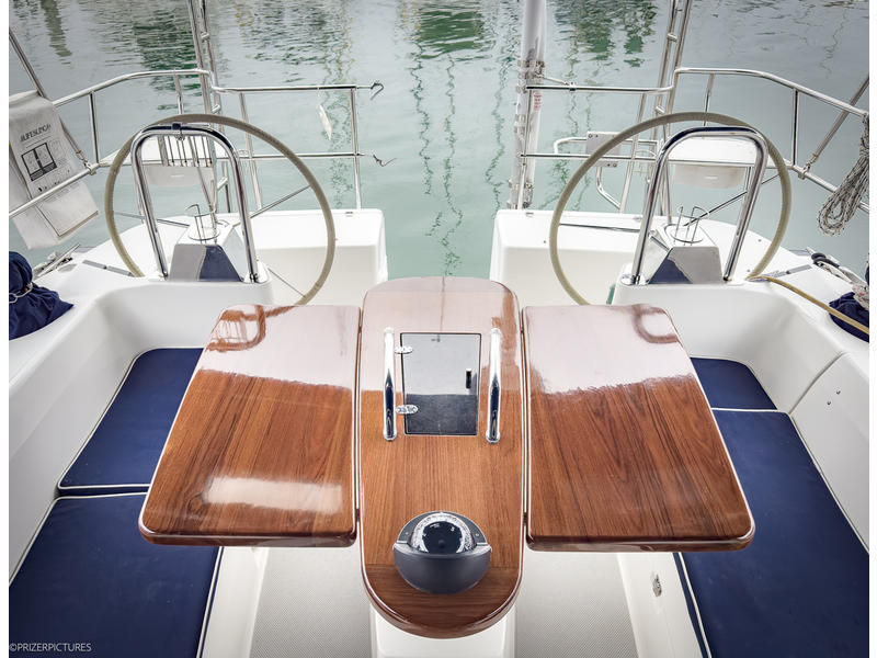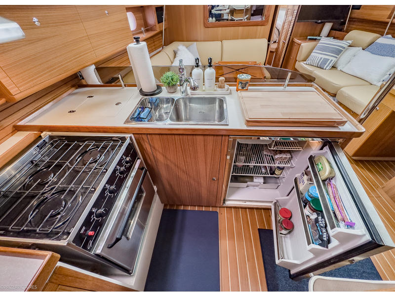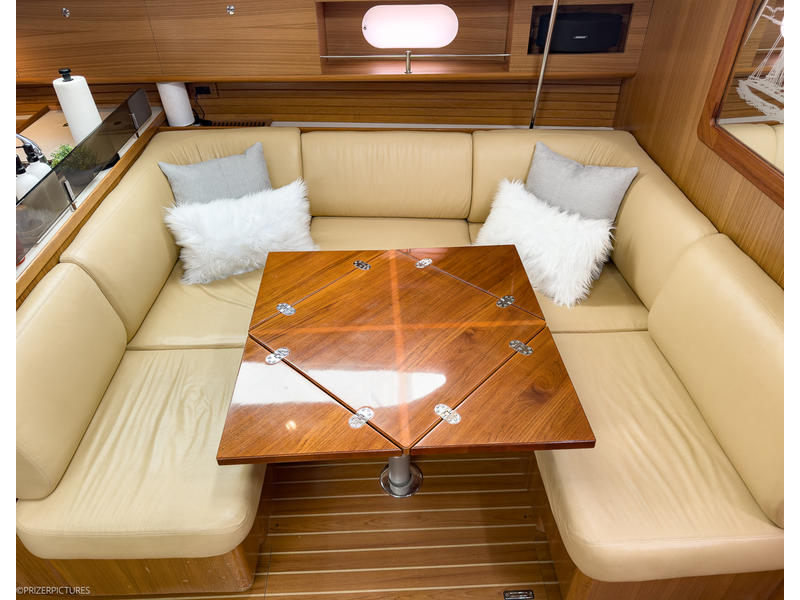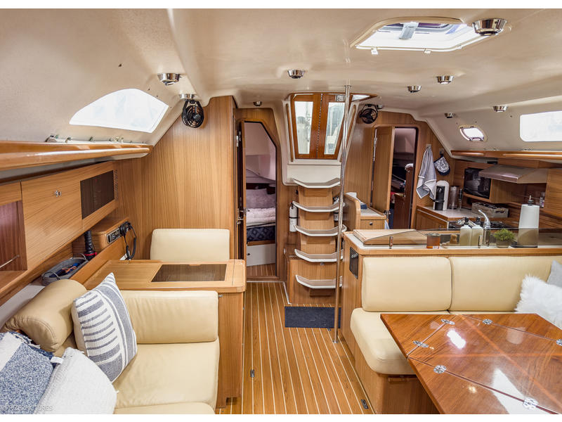 The interior of KINSHIP II is spacious, intelligently laid out, and beautifully finished in warm, varnished teak. Her two-cabin, two-head layoutwith Catalinas innovative flex cabin to portoffers versatile accommodations ideal for cruising couples, families, or guests. The salon is open and airy, with nearly 69 headroom and excellent natural light and ventilation. Thoughtful details, ample storage, and comfortable seating make extended stays aboard a pleasure.