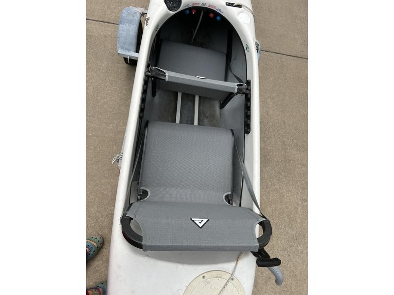 Very fast Hobie Ketterman Tri-foiler (Hull #103); custom seats, like-new sails. Photos are of actual sailboat and trailer that are for sale; be sure to watch the You Tube Hobie promotional video showing similar boats in action! Sails on foils approx 2.5x the speed of wind! Complete set of manuals in 3-ring binders. Longer detailed version available of the short walk around video of boat here: https://www.facebook.com/marketplace/item/2935355756644938/?ref=search&referral_code=null&referral_story_type=post&tracking=browse_serp:4151774e-1ffe-41e5-a483-0788f584e02e.