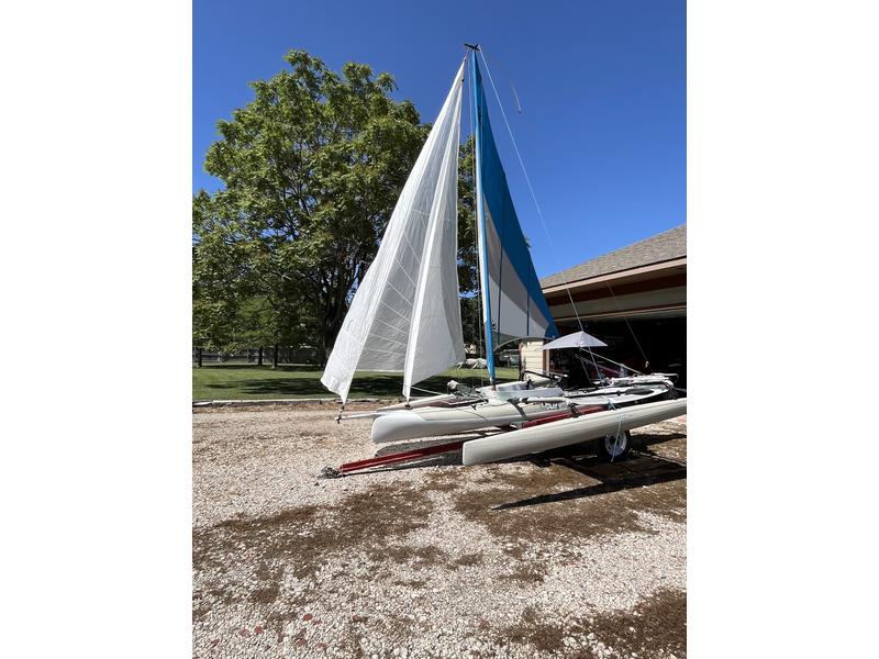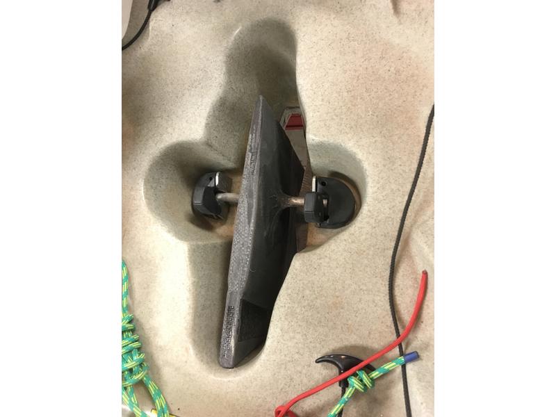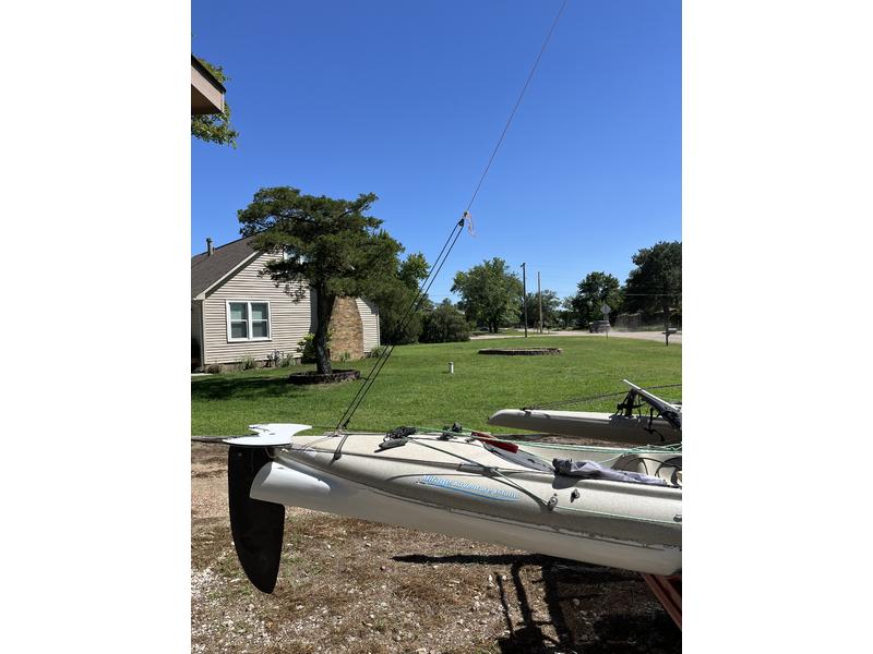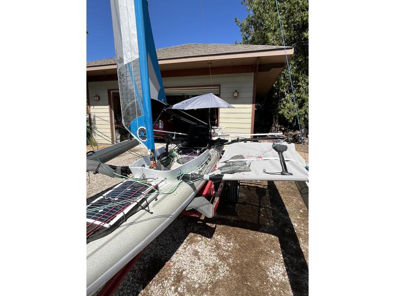 Heavily Modified 2015 Adventure Island (first year with mesh seat) has custom carbon bottom that cleans up the bottom for less drag and supports the bow sprint for the code 0. Also has a jib. Has a custom additional daggerboard that locks into the peddle bay and significantly improves windward ability. Carbon splash guard that stops most of the waves from rolling into the cockpit. Custom steering system greatly improves steering at higher speeds. Comes with a stock trailer cradle and a custom cradle to fit the carbon bottom. Includes trailer.