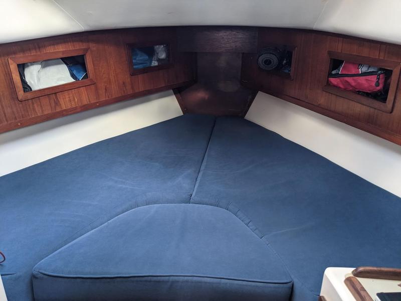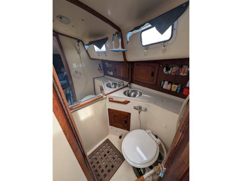 She has a large private double V-berth cabin with cupboards for storage, enclosed side shelves and a hanging locker. Separate entrance to the head, which is also accessible from the main salon. The head is equipped with a manual Raritan toilet with Y valve, sink, shower, and hot and cold pressure water.