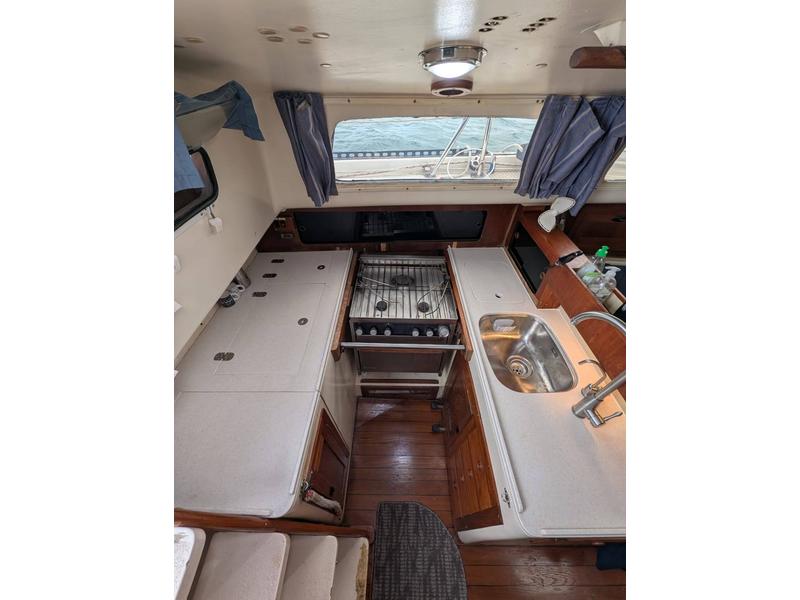 Galley Isotherm 41 installed below counter with additional 20 L cool box Force 10 three-burner stove and oven (propane) Stainless steel sink with freshwater pressure tap with hot and cold water and filtered water tap.