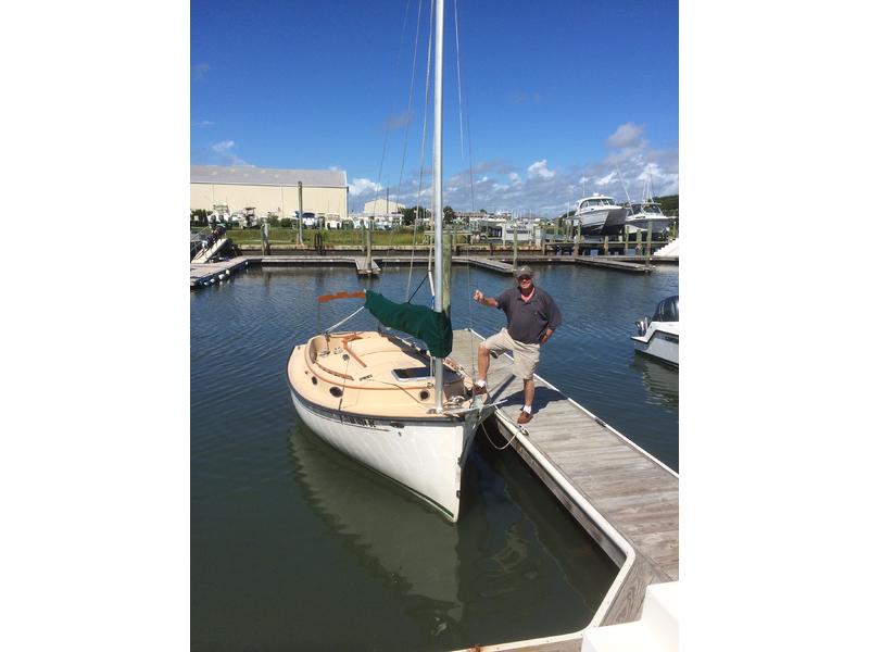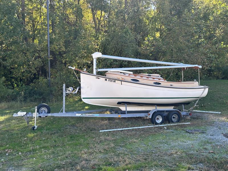 Compact horizon, gaff rig cat boat. Mast is on a hinge that allows her complete set up within 15 minutes. The boat has been stored inside for its entire history. Yamaha diesel engine allows boat to propel it up to 5 knots. Roomy Cuddy cabin will sleep too comfortably. Two Built-in sinks. With a private space forward of a bulkhead for a porta potty. Small portable stove included. Trailer is included. Boat needs to be rigged, engine needs to be serviced, hull needs to be polished. Trailer works, but would recommend new tires and bearings for any long distance trailering. Looking for a quick sale so I dont have to store for the winter and I dont want to have to do any maintenance. Boat is priced at half of competitions prices for this reason.
