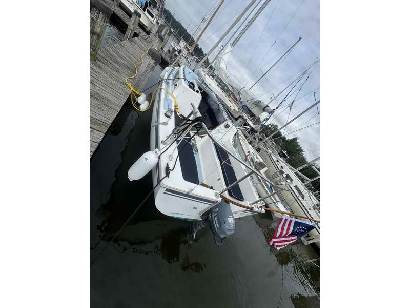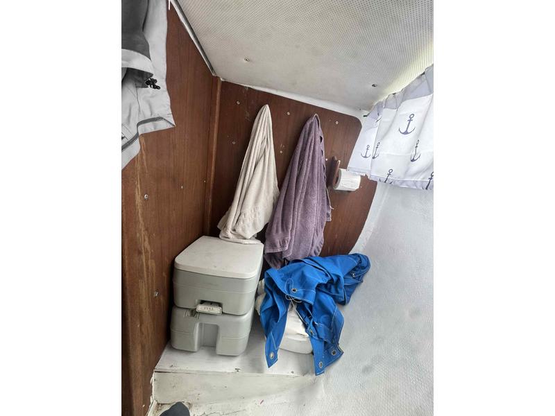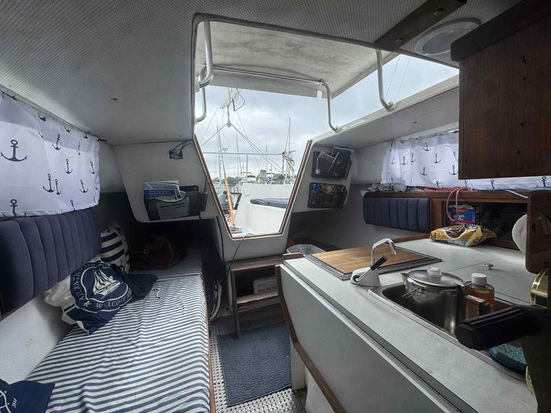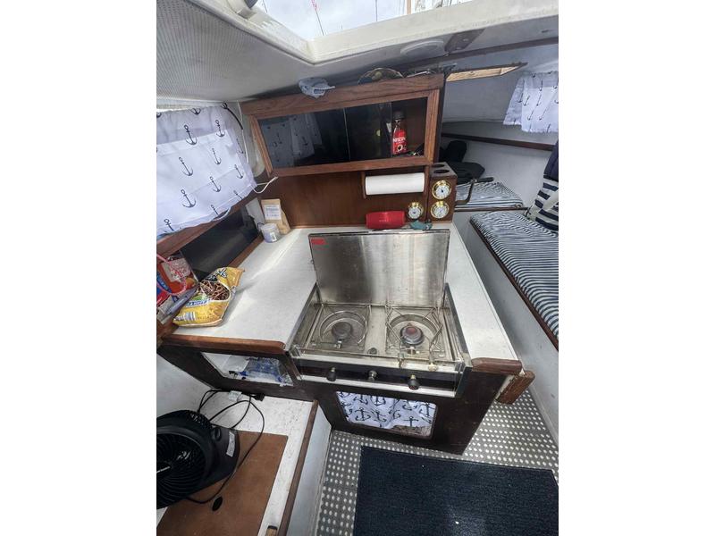 The cockpit cushions were new this spring. The galley stove has been retrofitted to propane. The sink is fed from gallon jugs under the counter. There is a chemical head in front of the midships bulkhead which provides some privacy.